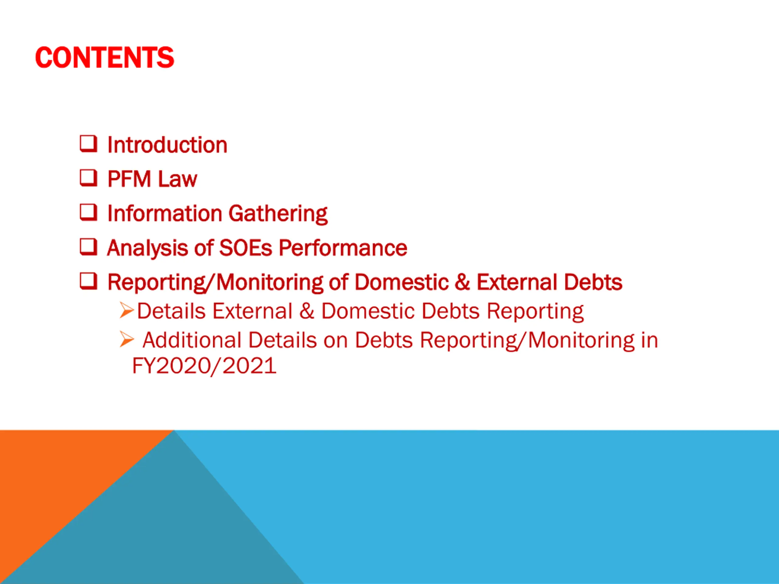CONTENTS CONTENTS Introduction Introduction PFM Law PFM Law Information Gathering Information Gathering Analysis of SOEs Performance Analysis of SOEs Performance Reporting/Monitoring of Domestic & External Debts Reporting/Monitoring of Domestic & External Debts Details External & Domestic Debts Reporting Additional Details on Debts Reporting/Monitoring in FY2020/2021