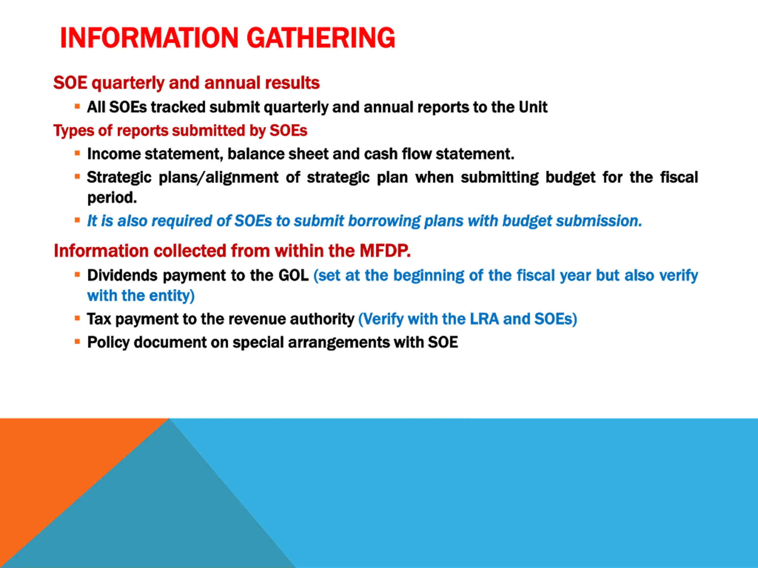 INFORMATION GATHERING INFORMATION GATHERING SOE quarterly and annual results SOE quarterly and annual results All SOEs tracked submit quarterly and annual reports to the Unit All SOEs tracked submit quarterly and annual reports to the Unit Types of reports submitted by SOEs Types of reports submitted by SOEs Income Income statement, statement, balance balance sheet sheet and Strategic Strategic plans/alignment plans/alignment of of strategic period period. . It It is is also also required required of of SOEs SOEs to to submit submit borrowing and cash cash flow strategic plan flow statement statement. . plan when when submitting submitting budget budget for for the the fiscal fiscal borrowing plans plans with with budget budget submission submission. . Information Information collected Dividends Dividends payment with with the the entity) Tax Tax payment payment to to the Policy Policy document document on collected from payment to to the entity) the revenue on special from within within the the GOL GOL (set the MFDP MFDP. . (set at at the the beginning beginning of of the the fiscal fiscal year year but but also also verify verify revenue authority authority (Verify special arrangements arrangements with (Verify with with SOE with the SOE the LRA LRA and and SOEs) SOEs)