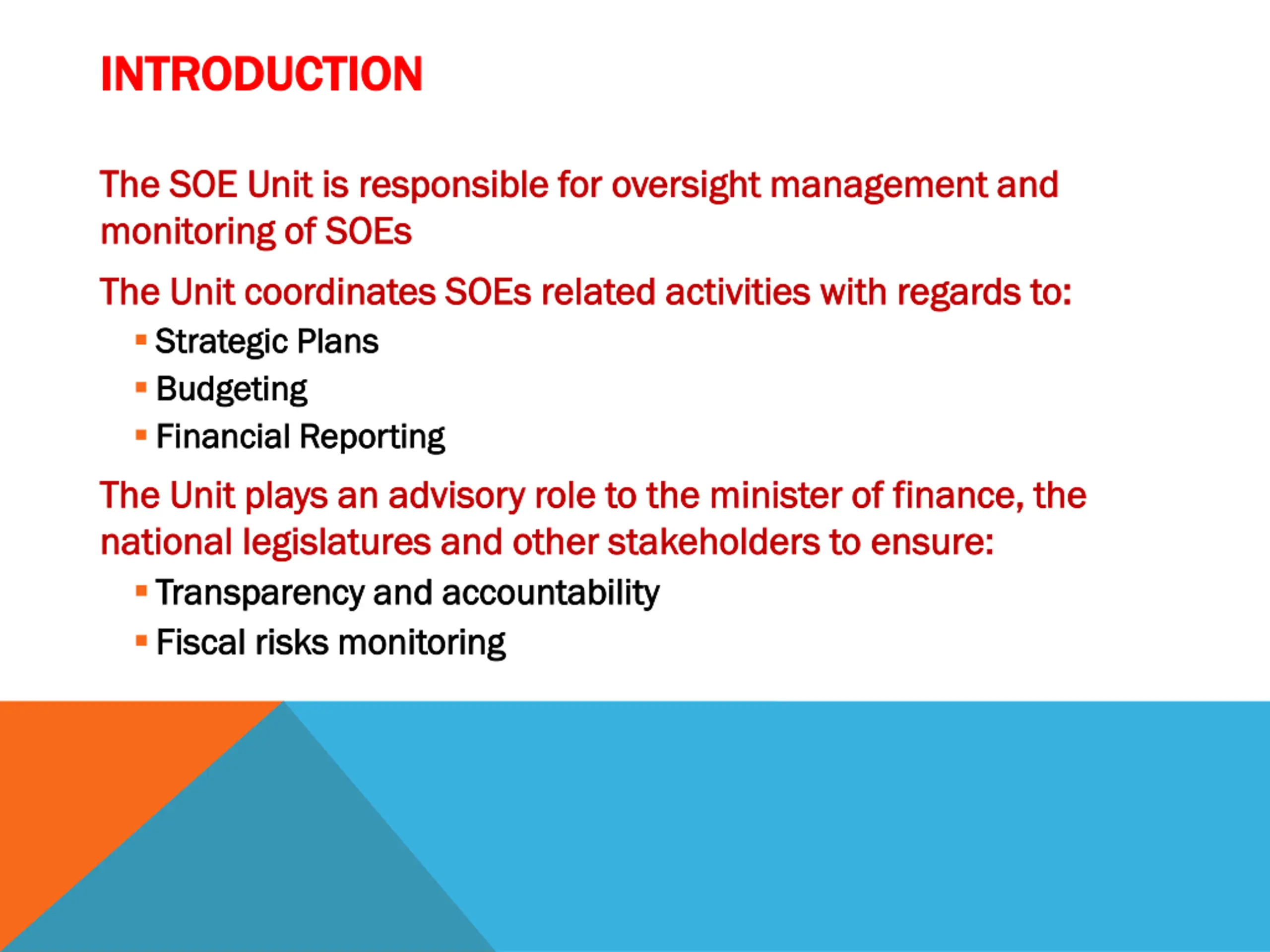 INTRODUCTION INTRODUCTION The SOE Unit is responsible for oversight management and The SOE Unit is responsible for oversight management and monitoring of SOEs monitoring of SOEs The Unit coordinates SOEs related activities with regards to: The Unit coordinates SOEs related activities with regards to: Strategic Plans Strategic Plans Budgeting Budgeting Financial Reporting Financial Reporting The Unit plays an advisory role to the minister of finance, the The Unit plays an advisory role to the minister of finance, the national legislatures and other stakeholders to ensure: national legislatures and other stakeholders to ensure: Transparency and accountability Transparency and accountability Fiscal risks monitoring Fiscal risks monitoring