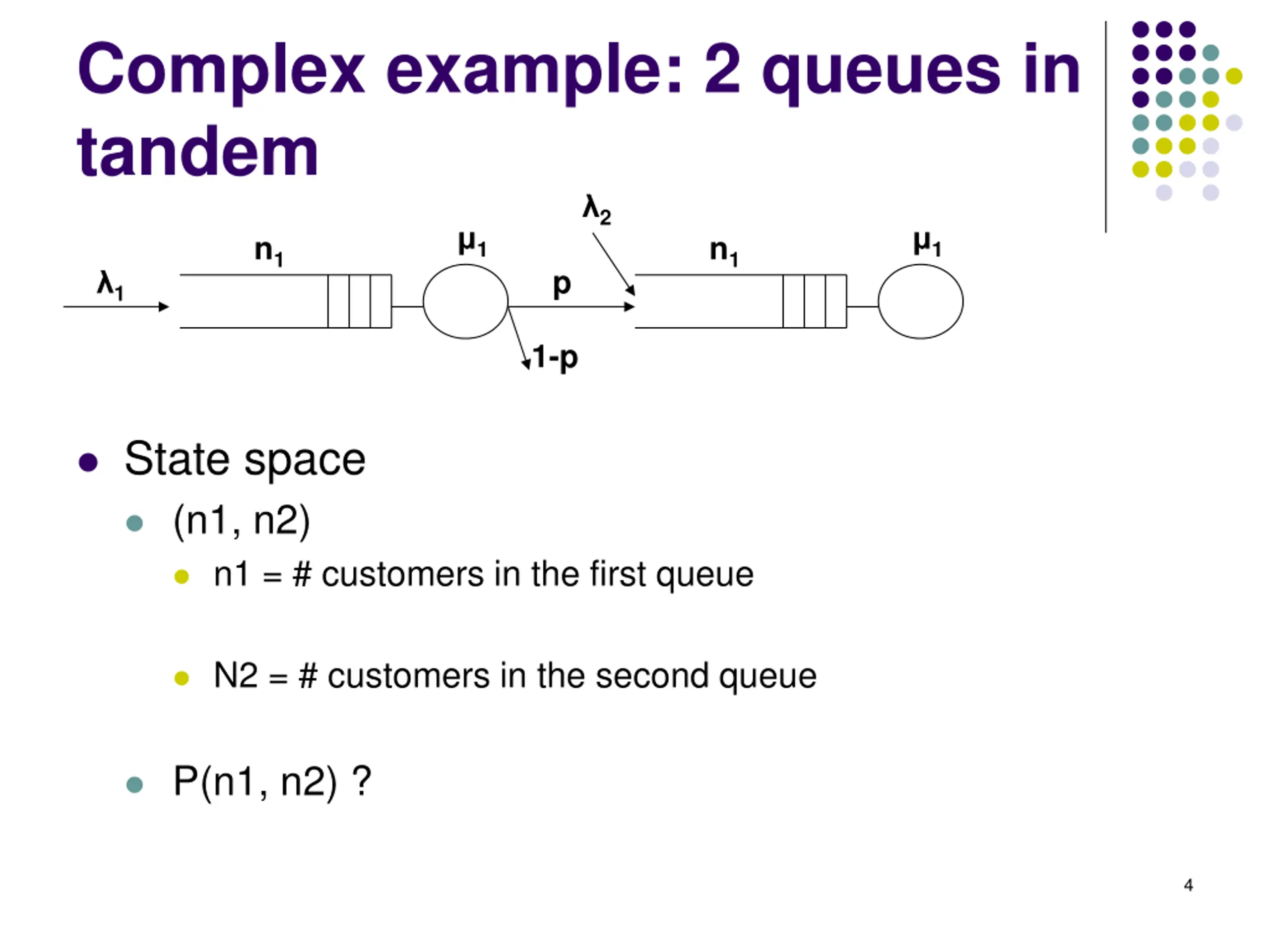 Complex example: 2 queues in tandem 2 1 1 n1 n1 p 1 1-p State space (n1, n2) n1 = # customers in the first queue N2 = # customers in the second queue P(n1, n2) ? 4