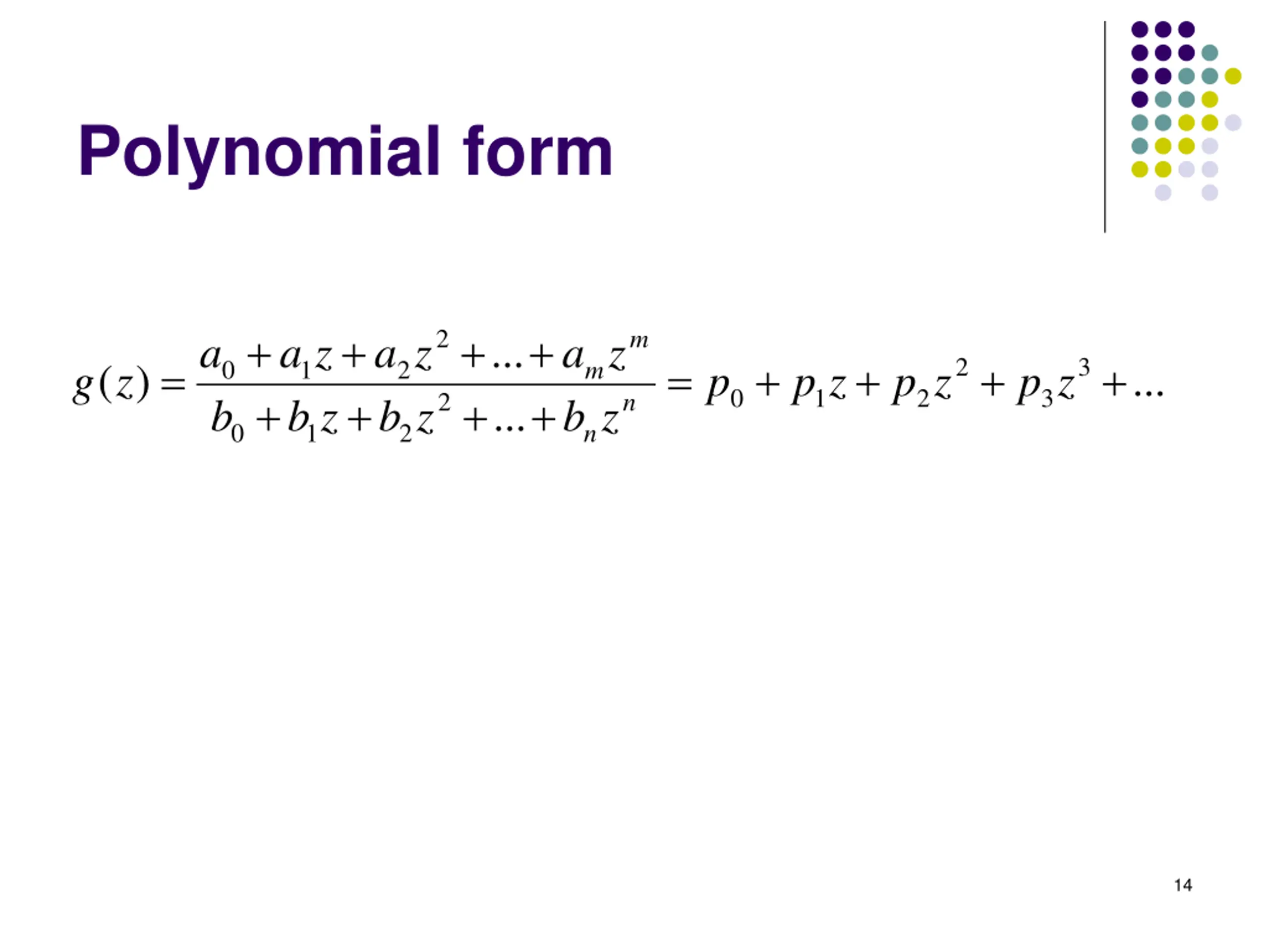 Polynomial form + + + + 2 m ... a a z a z a z = = + + + + 2 3 0 1 2 ( ) ... m g z p p z p z p z 0 1 2 3 + + + + 2 n ... b b z b z b z 0 1 2 n 14