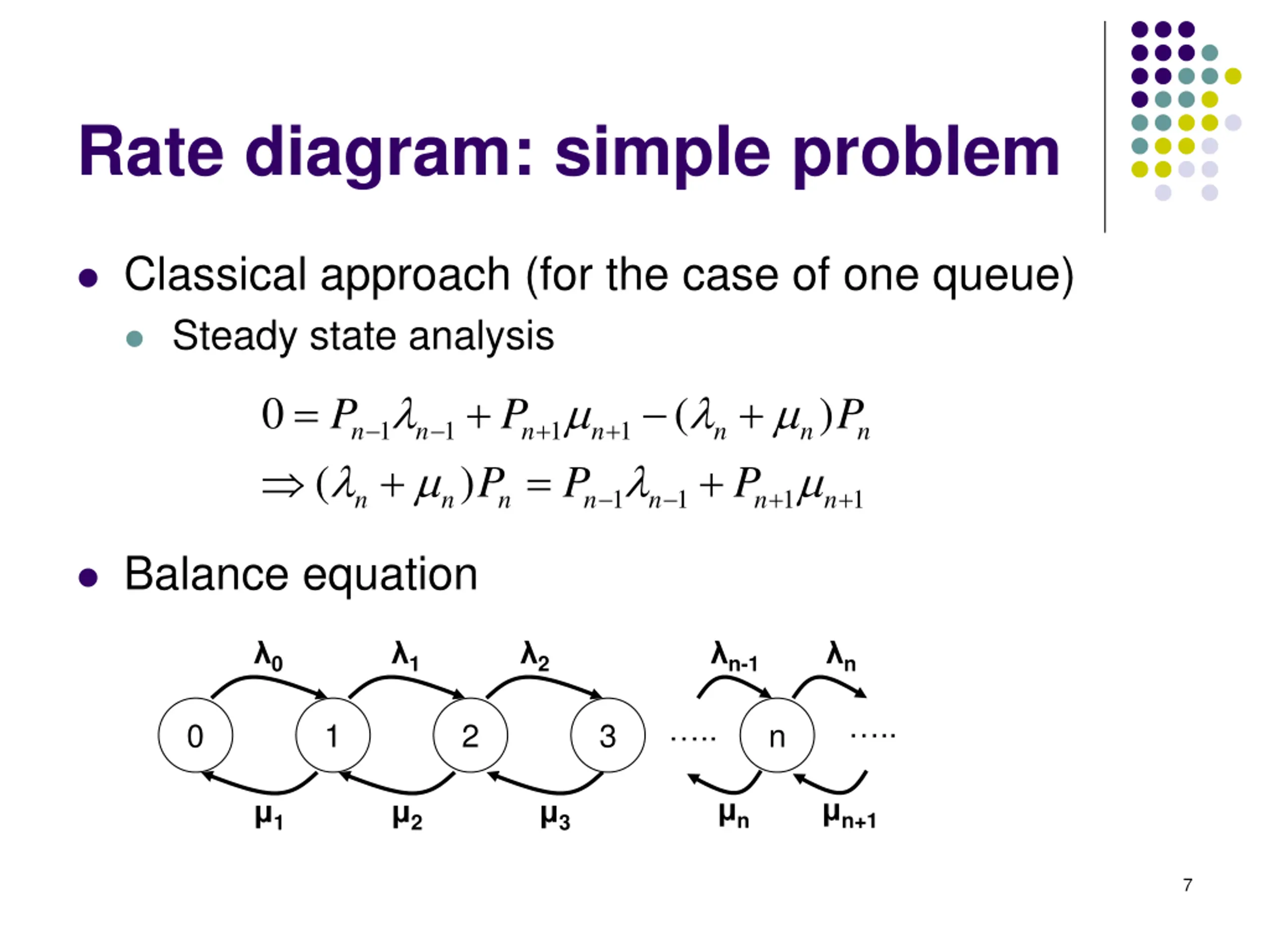 Rate diagram: simple problem Classical approach (for the case of one queue) Steady state analysis = + P + P 0 ( ) P P P + + 1 + 1 1 1 n n n n n n n = + ( ) P + + 1 1 1 1 n n n n n n n Balance equation 0 1 2 n-1 n .. .. 0 1 2 3 n n n+1 1 2 3 7