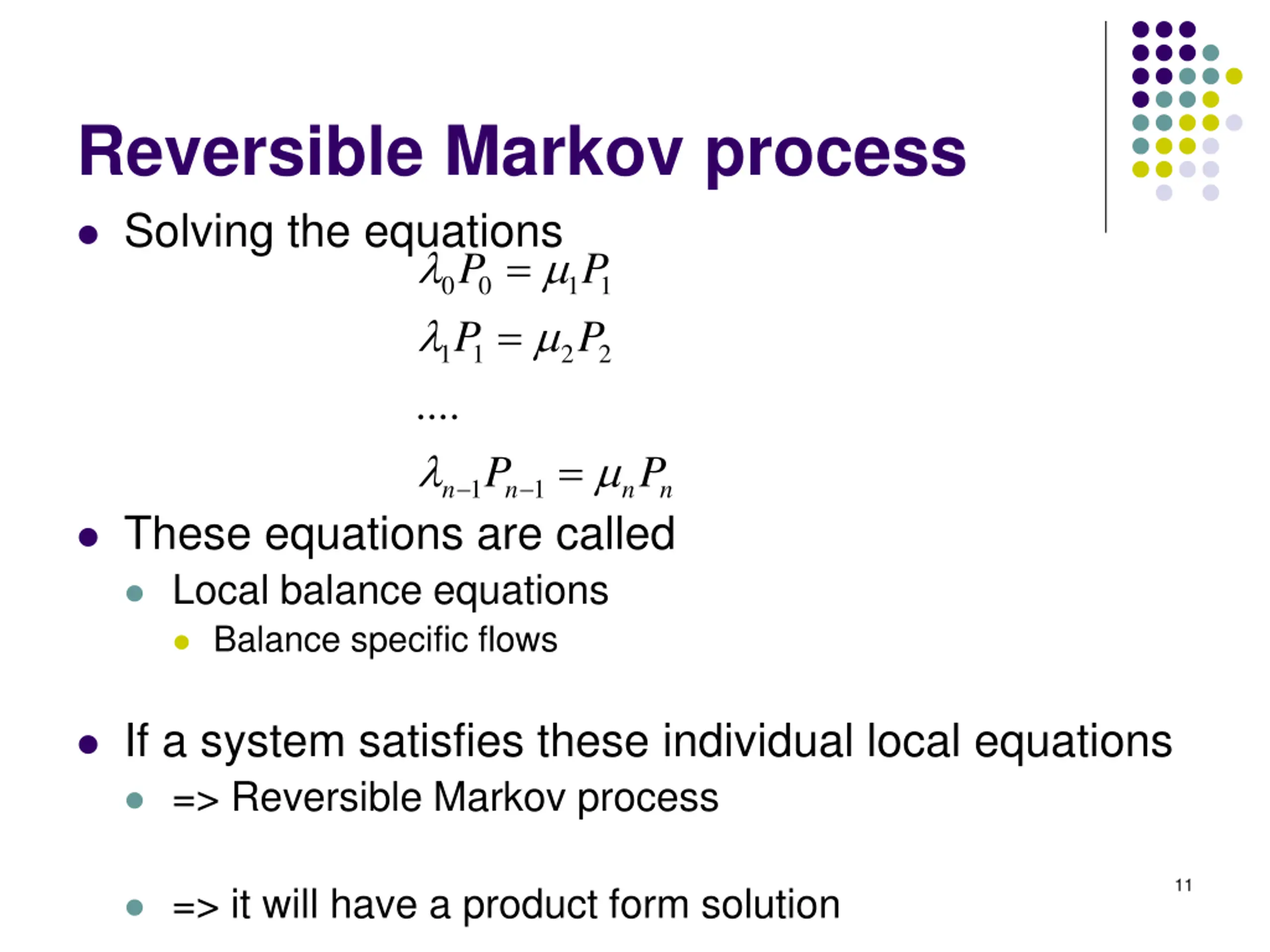 Reversible Markov process Solving the equations P = 1 1 .... = P 0 0 1 1 P P 2 2 = P P 1 1 n n n n These equations are called Local balance equations Balance specific flows If a system satisfies these individual local equations => Reversible Markov process 11 => it will have a product form solution