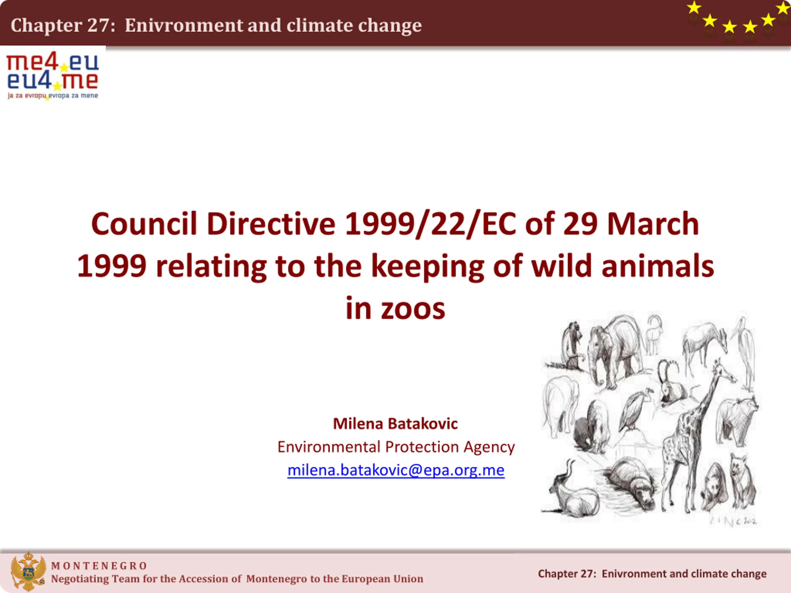 Chapter 27: Enivronment and climate change Council Directive 1999/22/EC of 29 March 1999 relating to the keeping of wild animals in zoos Milena Batakovic Environmental Protection Agency milena.batakovic@epa.org.me M O N T E N E G R O Negotiating Team for the Accession of Montenegro to the European Union Chapter 27: Enivronment and climate change