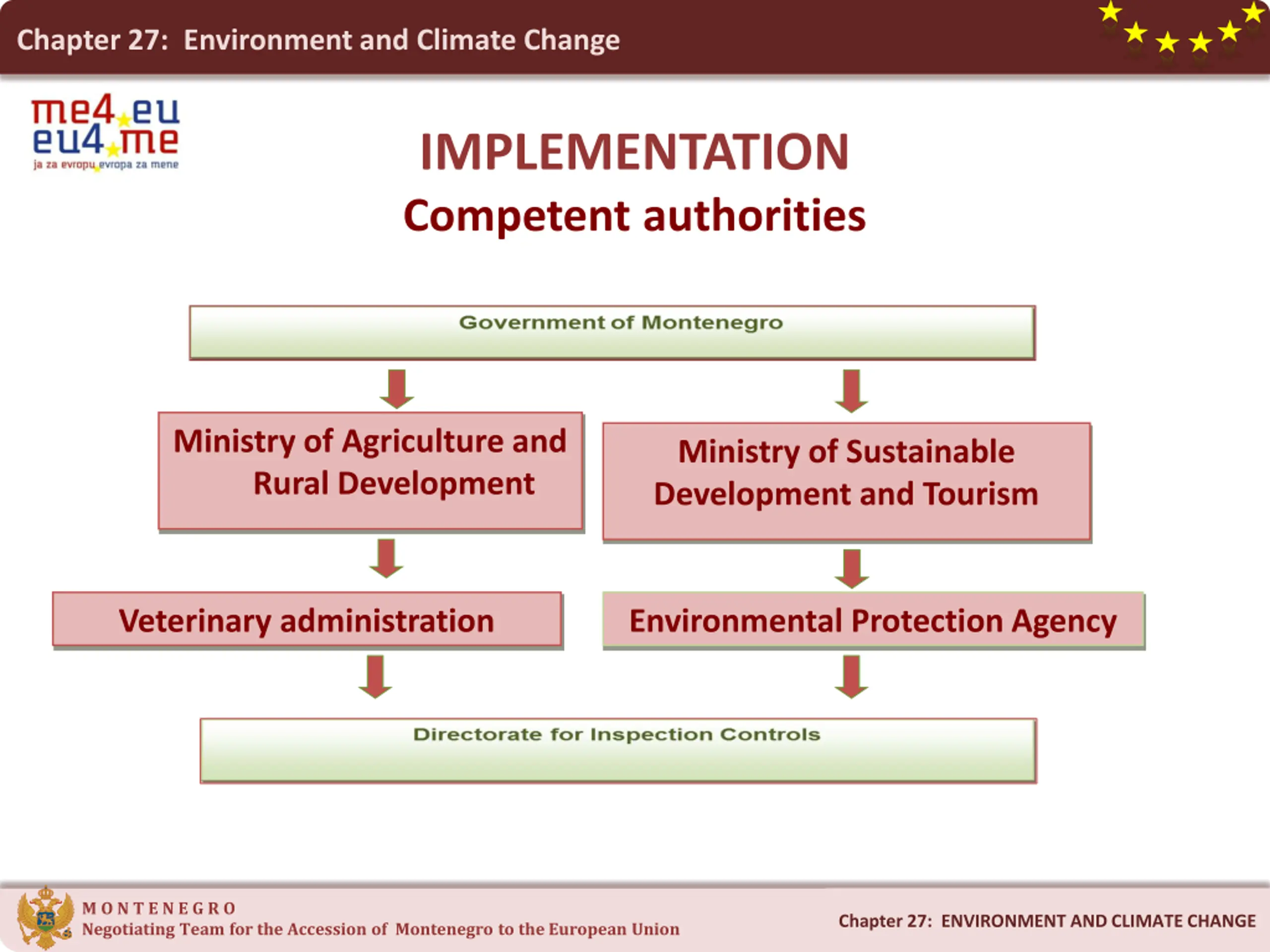 Chapter 27: Environment and Climate Change IMPLEMENTATION Competent authorities Ministry of Agriculture and Rural Development Ministry of Sustainable Development and Tourism Veterinary administration Environmental Protection Agency M O N T E N E G R O Negotiating Team for the Accession of Montenegro to the European Union Chapter 27: ENVIRONMENT Chapter 27: ENVIRONMENT AND CLIMATE CHANGE