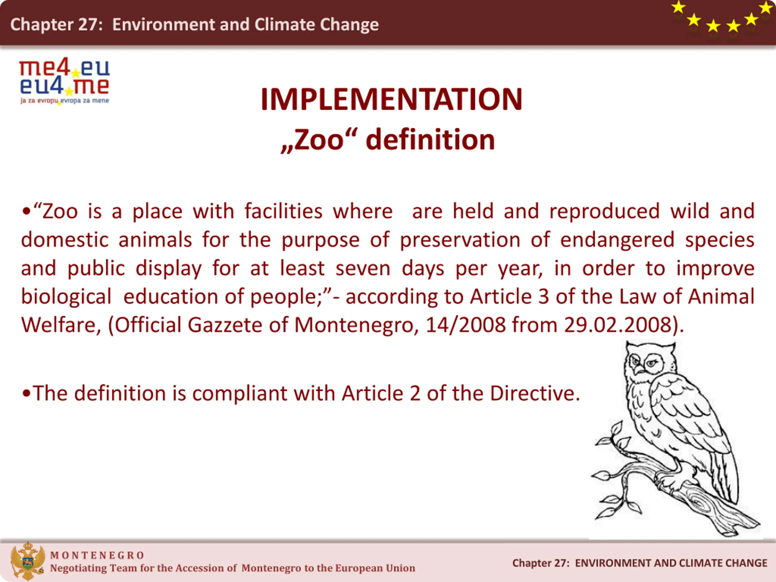 Chapter 27: Environment and Climate Change IMPLEMENTATION Zoo definition Zoo is a place with facilities where are held and reproduced wild and domestic animals for the purpose of preservation of endangered species and public display for at least seven days per year, in order to improve biological education of people; - according to Article 3 of the Law of Animal Welfare, (Official Gazzete of Montenegro, 14/2008 from 29.02.2008). The definition is compliant with Article 2 of the Directive. M O N T E N E G R O Negotiating Team for the Accession of Montenegro to the European Union Chapter 27: ENVIRONMENT AND CLIMATE CHANGE