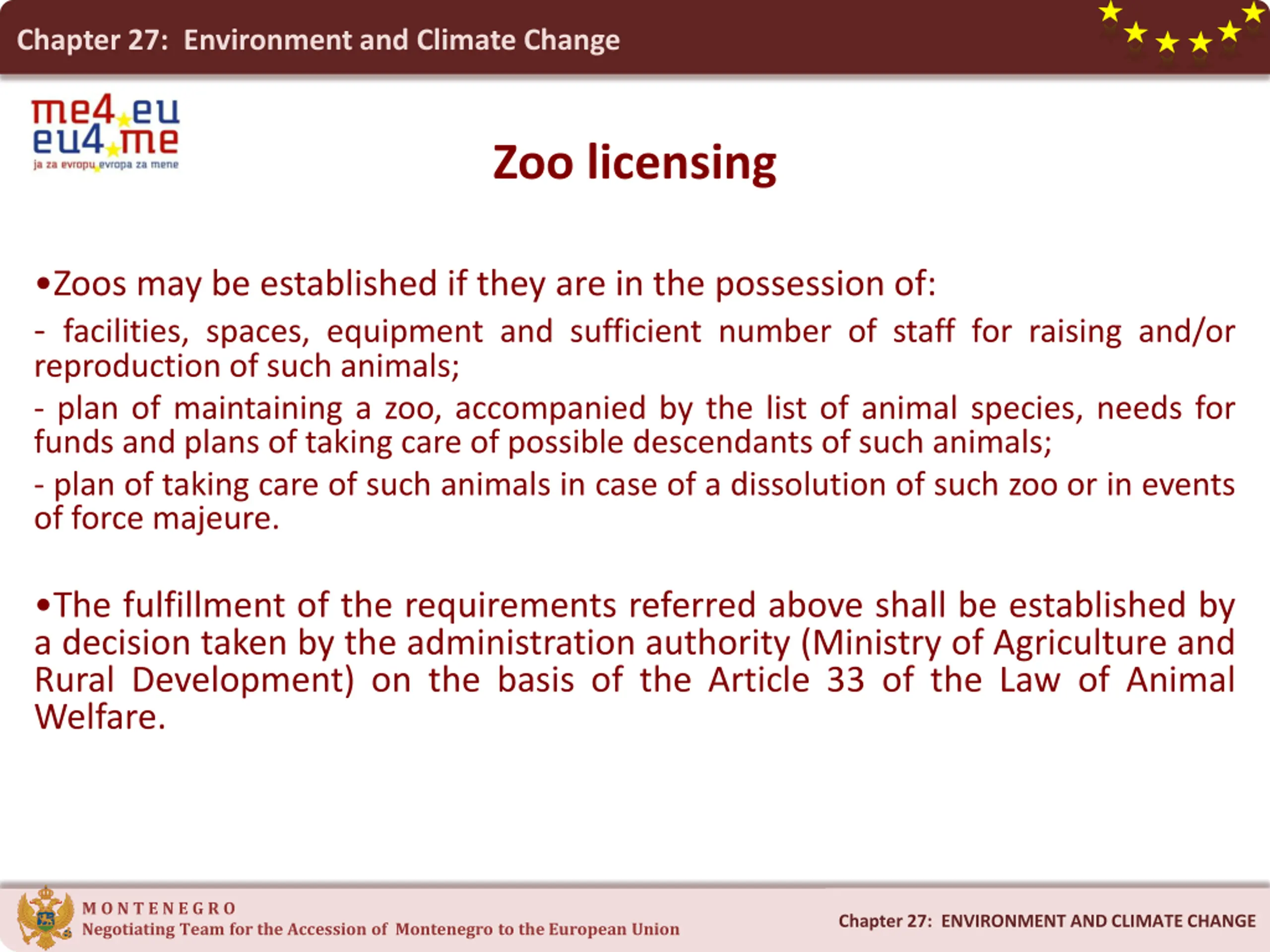 Chapter 27: Environment and Climate Change Zoo licensing Zoos may be established if they are in the possession of: - facilities, spaces, equipment and sufficient number of staff for raising and/or reproduction of such animals; - plan of maintaining a zoo, accompanied by the list of animal species, needs for funds and plans of taking care of possible descendants of such animals; - plan of taking care of such animals in case of a dissolution of such zoo or in events of force majeure. The fulfillment of the requirements referred above shall be established by a decision taken by the administration authority (Ministry of Agriculture and Rural Development) on the basis of the Article 33 of the Law of Animal Welfare. M O N T E N E G R O Negotiating Team for the Accession of Montenegro to the European Union Chapter 27: ENVIRONMENT Chapter 27: ENVIRONMENT AND CLIMATE CHANGE