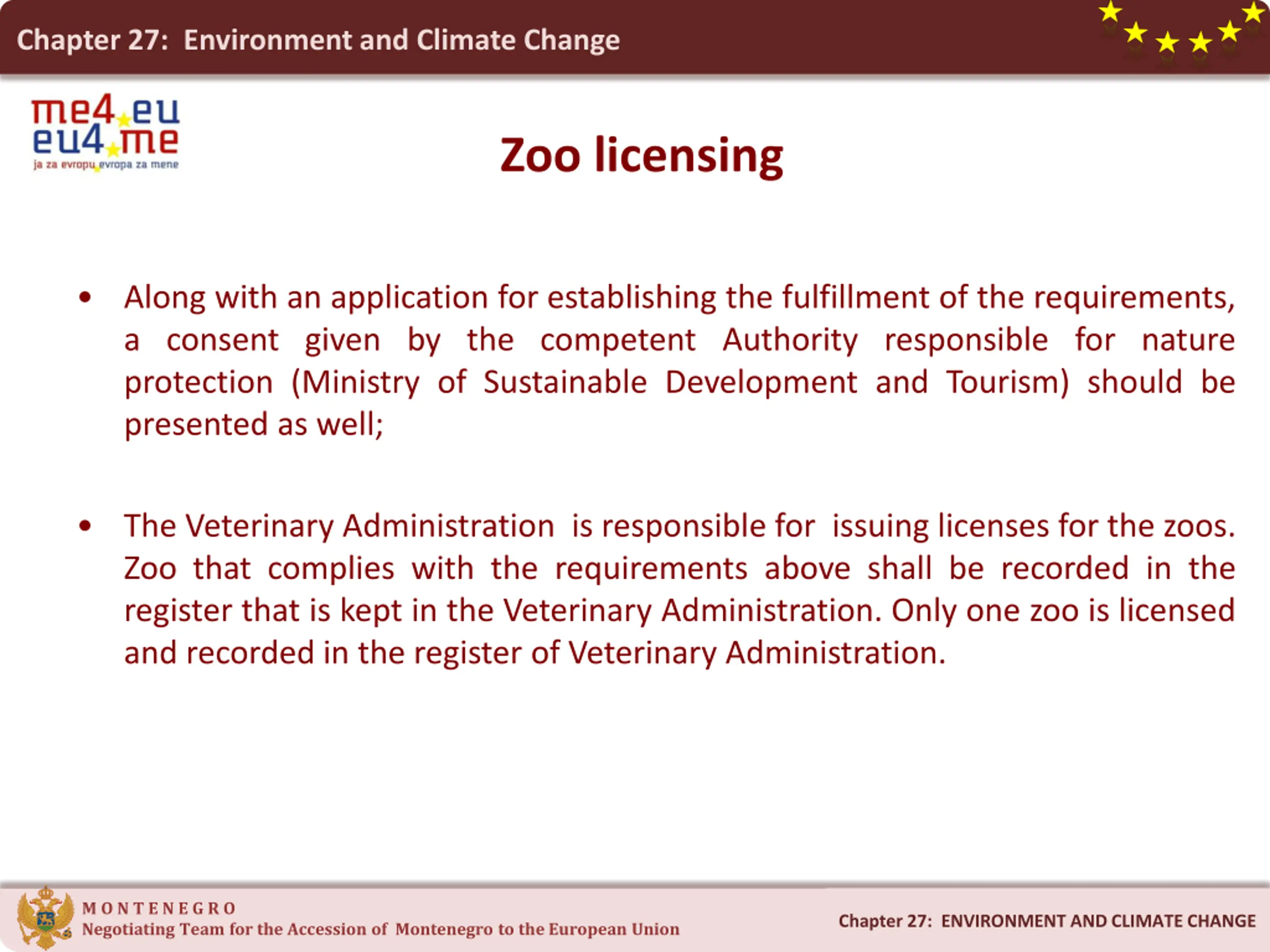 Chapter 27: Environment and Climate Change Zoo licensing Along with an application for establishing the fulfillment of the requirements, a consent given by the competent Authority responsible for nature protection (Ministry of Sustainable Development and Tourism) should be presented as well; The Veterinary Administration is responsible for issuing licenses for the zoos. Zoo that complies with the requirements above shall be recorded in the register that is kept in the Veterinary Administration. Only one zoo is licensed and recorded in the register of Veterinary Administration. M O N T E N E G R O Negotiating Team for the Accession of Montenegro to the European Union Chapter 27: ENVIRONMENT Chapter 27: ENVIRONMENT AND CLIMATE CHANGE