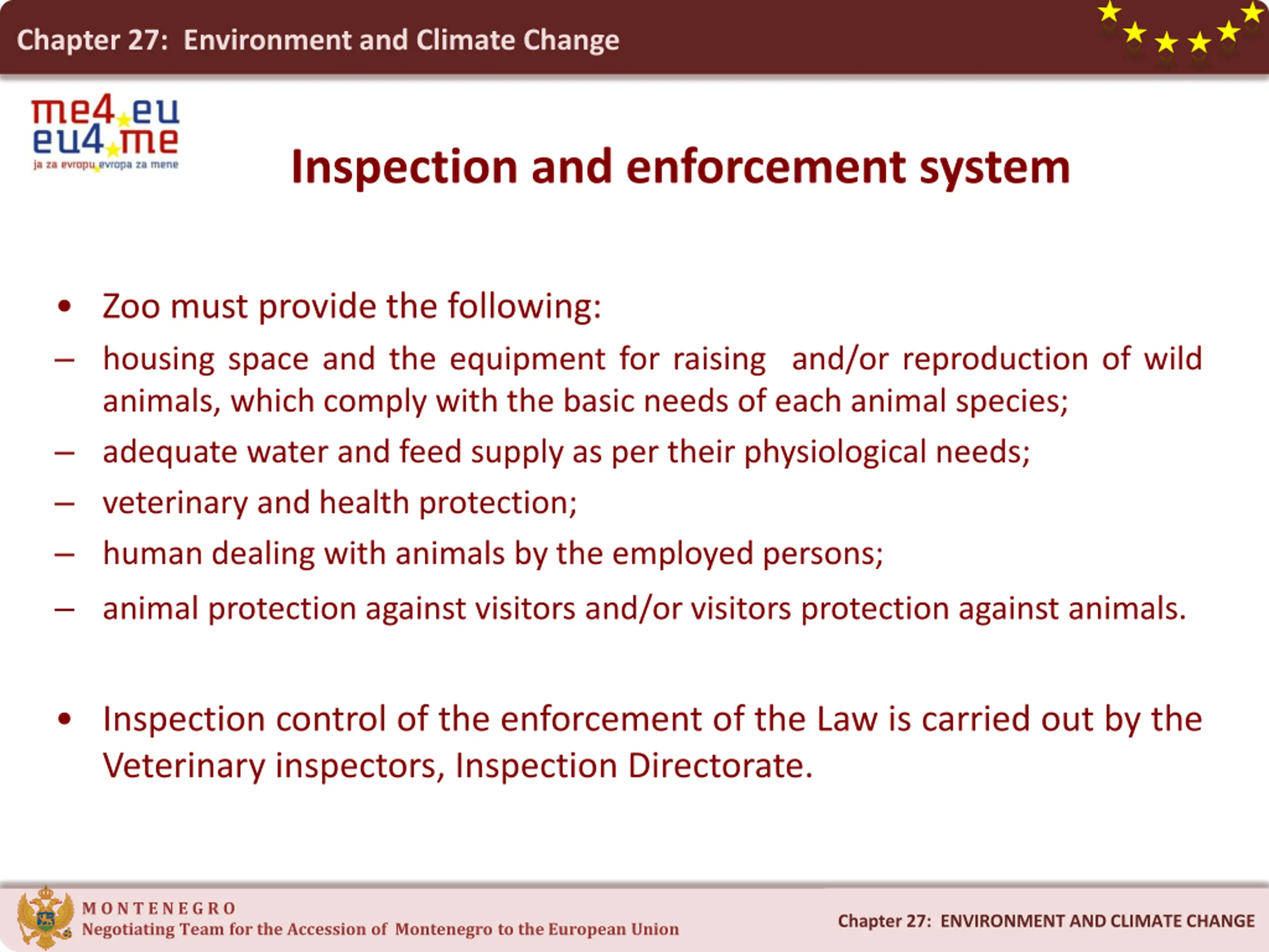 Chapter 27: Environment and Climate Change Inspection and enforcement system Zoo must provide the following: housing space and the equipment for raising and/or reproduction of wild animals, which comply with the basic needs of each animal species; adequate water and feed supply as per their physiological needs; veterinary and health protection; human dealing with animals by the employed persons; animal protection against visitors and/or visitors protection against animals. Inspection control of the enforcement of the Law is carried out by the Veterinary inspectors, Inspection Directorate. M O N T E N E G R O Negotiating Team for the Accession of Montenegro to the European Union Chapter 27: ENVIRONMENT Chapter 27: ENVIRONMENT AND CLIMATE CHANGE