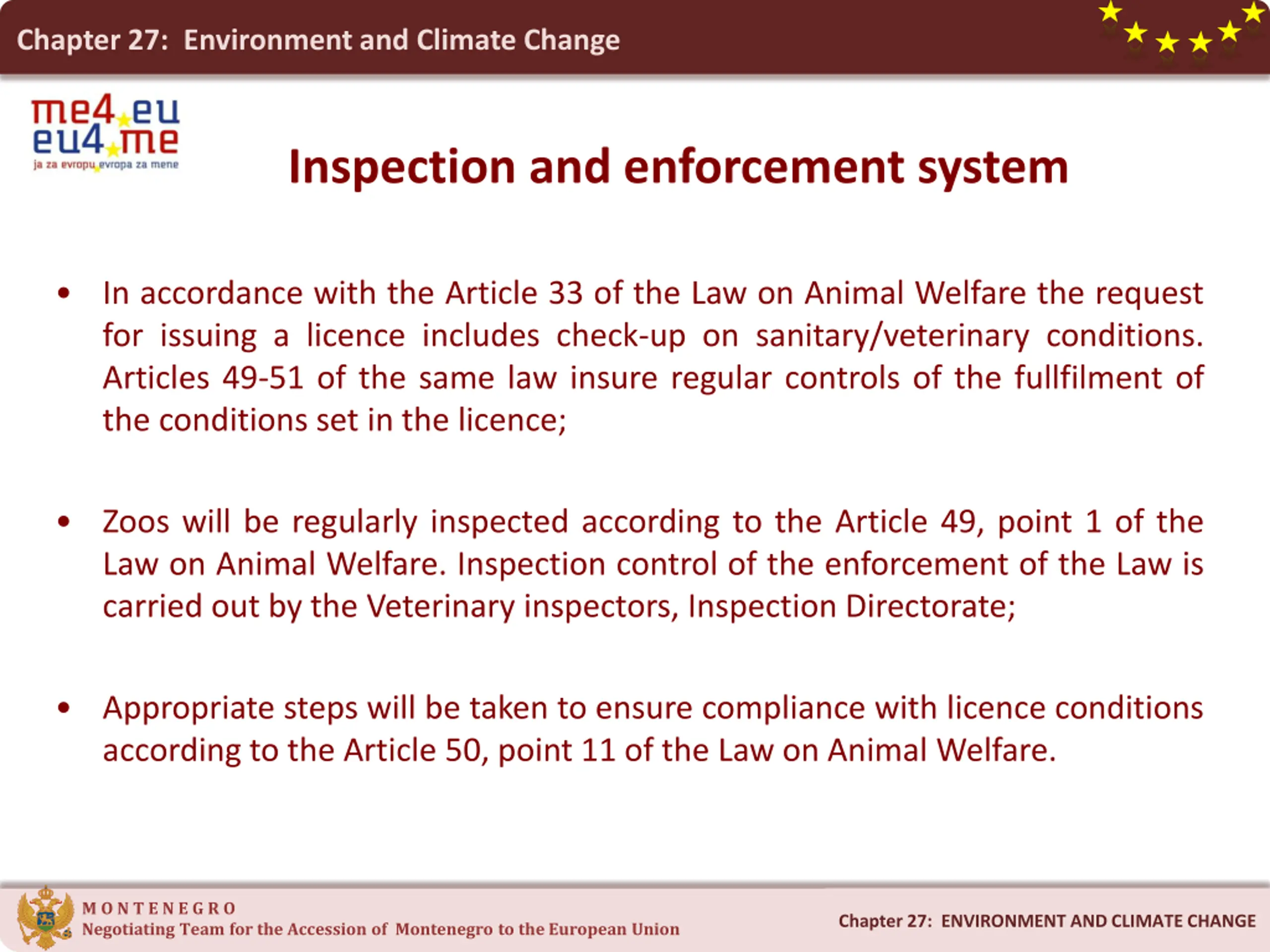 Chapter 27: Environment and Climate Change Inspection and enforcement system In accordance with the Article 33 of the Law on Animal Welfare the request for issuing a licence includes check-up on sanitary/veterinary conditions. Articles 49-51 of the same law insure regular controls of the fullfilment of the conditions set in the licence; Zoos will be regularly inspected according to the Article 49, point 1 of the Law on Animal Welfare. Inspection control of the enforcement of the Law is carried out by the Veterinary inspectors, Inspection Directorate; Appropriate steps will be taken to ensure compliance with licence conditions according to the Article 50, point 11 of the Law on Animal Welfare. M O N T E N E G R O Negotiating Team for the Accession of Montenegro to the European Union Chapter 27: ENVIRONMENT Chapter 27: ENVIRONMENT AND CLIMATE CHANGE