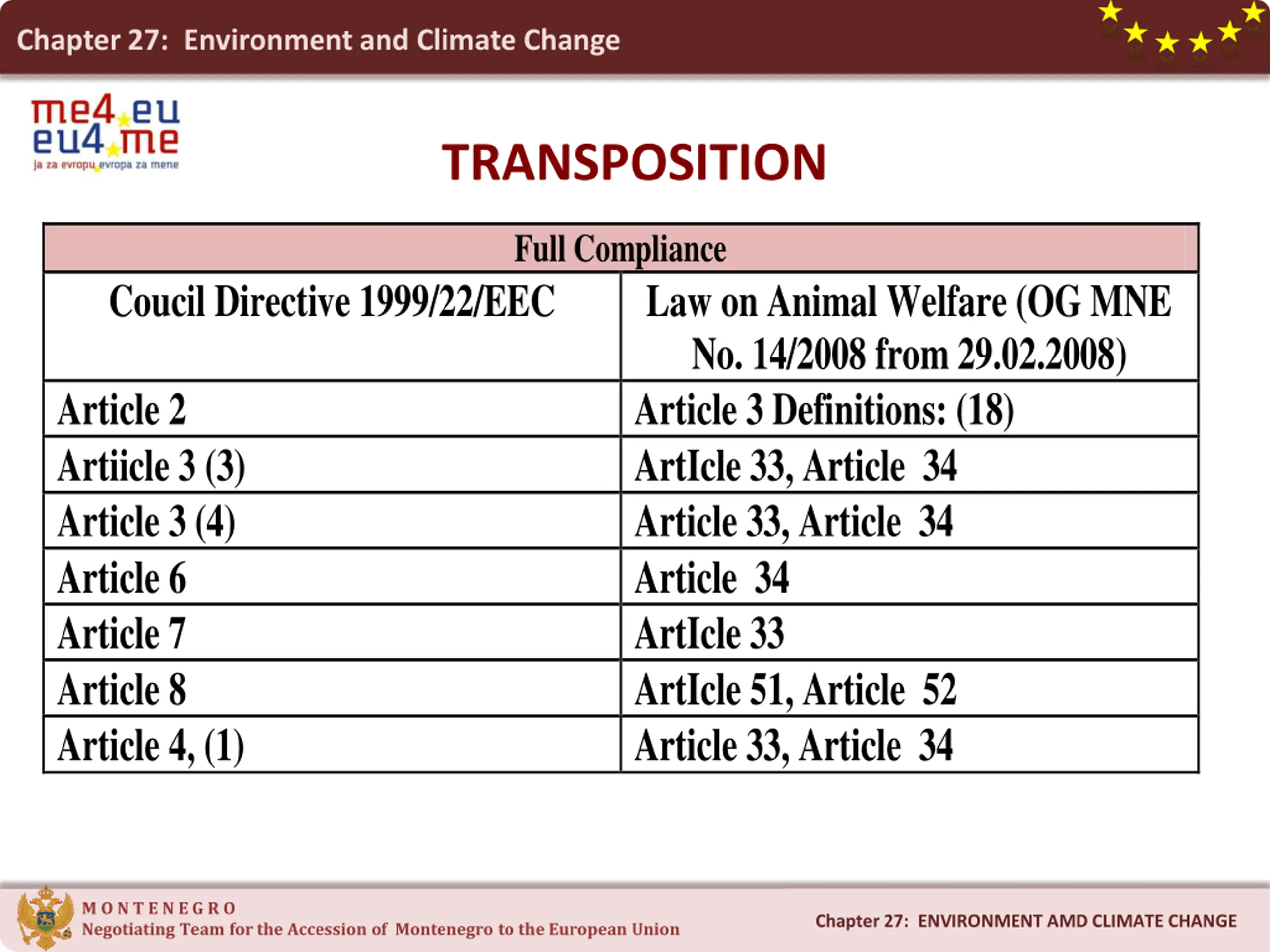 Chapter 27: Environment and Climate Change TRANSPOSITION Full Compliance Coucil Directive 1999/22/EEC Law on Animal Welfare (OG MNE No. 14/2008 from 29.02.2008) Article 3 Definitions: (18) ArtIcle 33, Article 34 Article 33, Article 34 Article 34 ArtIcle 33 ArtIcle 51, Article 52 Article 33, Article 34 Article 2 Artiicle 3 (3) Article 3 (4) Article 6 Article 7 Article 8 Article 4, (1) M O N T E N E G R O Negotiating Team for the Accession of Montenegro to the European Union Chapter 27: ENVIRONMENT AMD CLIMATE CHANGE