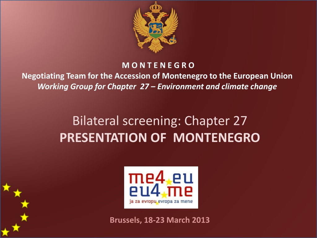 M O N T E N E G R O Negotiating Team for the Accession of Montenegro to the European Union Working Group for Chapter 27 Environment and climate change Bilateral screening: Chapter 27 PRESENTATION OF MONTENEGRO Brussels, 18-23 March 2013