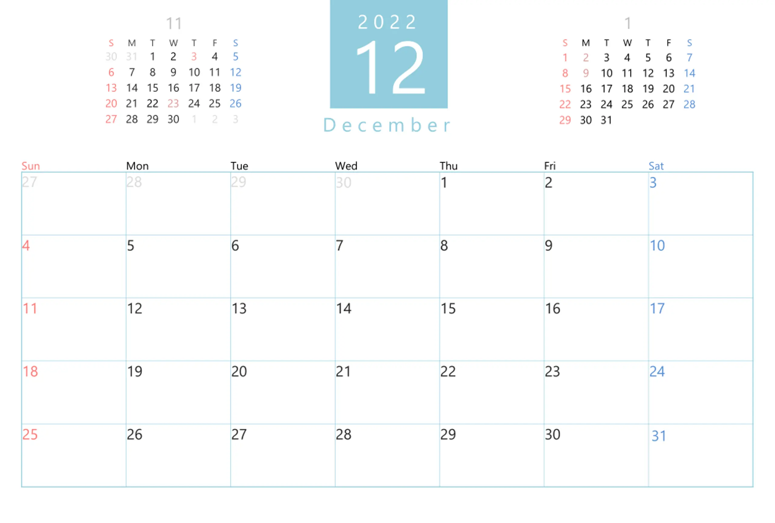2 0 2 2 1 W 4 11 W 2 9 12 D e c e m b e r S 1 8 M 2 9 T 3 T 5 F 6 S 7 S M T 1 8 T 3 F 4 S 5 30 31 6 13 14 15 16 17 18 19 20 21 22 23 24 25 26 27 28 29 30 7 10 11 12 10 11 12 13 14 15 16 17 18 19 20 21 22 23 24 25 26 27 28 29 30 31 1 2 3 Sun 27 Mon 28 Tue 29 Wed 30 Thu 1 Fri 2 Sat 3 4 5 6 7 8 9 10 11 12 13 14 15 16 17 18 19 20 21 22 23 24 25 26 27 28 29 30 31