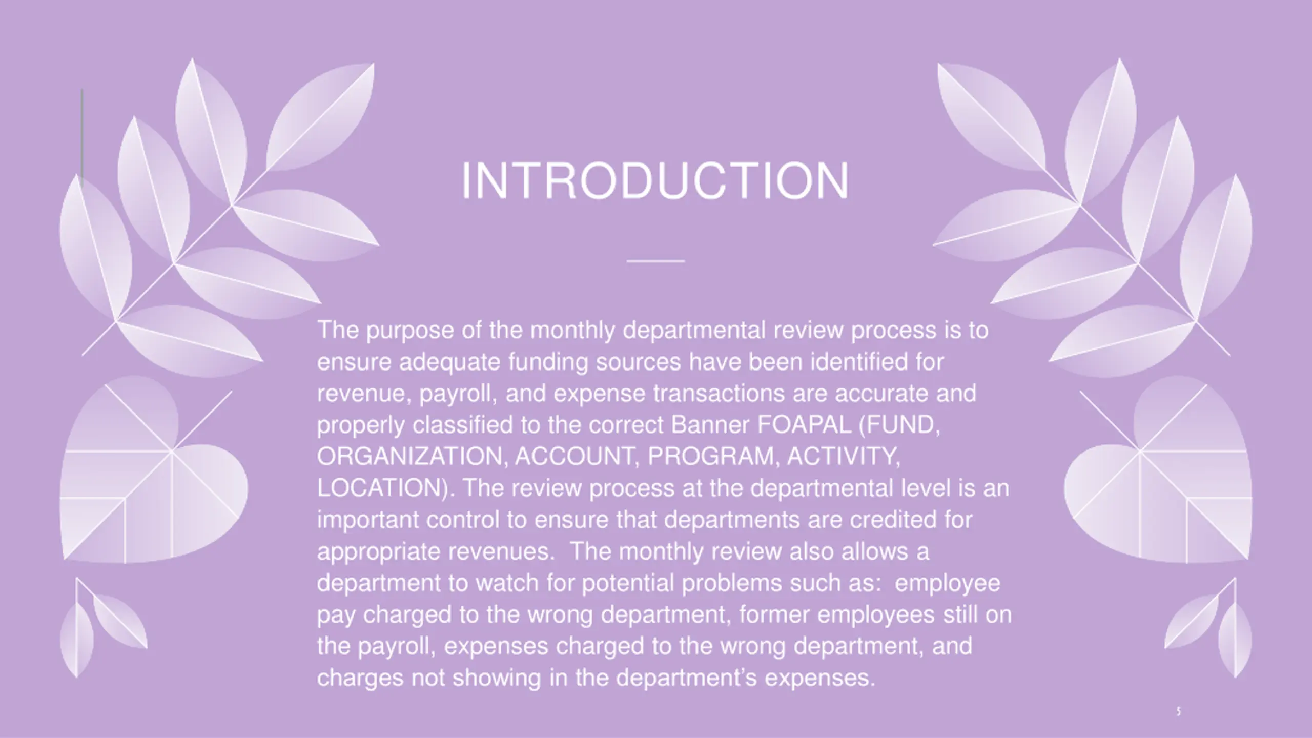 INTRODUCTION The purpose of the monthly departmental review process is to ensure adequate funding sources have been identified for revenue, payroll, and expense transactions are accurate and properly classified to the correct Banner FOAPAL (FUND, ORGANIZATION, ACCOUNT, PROGRAM, ACTIVITY, LOCATION). The review process at the departmental level is an important control to ensure that departments are credited for appropriate revenues. The monthly review also allows a department to watch for potential problems such as: employee pay charged to the wrong department, former employees still on the payroll, expenses charged to the wrong department, and charges not showing in the department s expenses. 5
