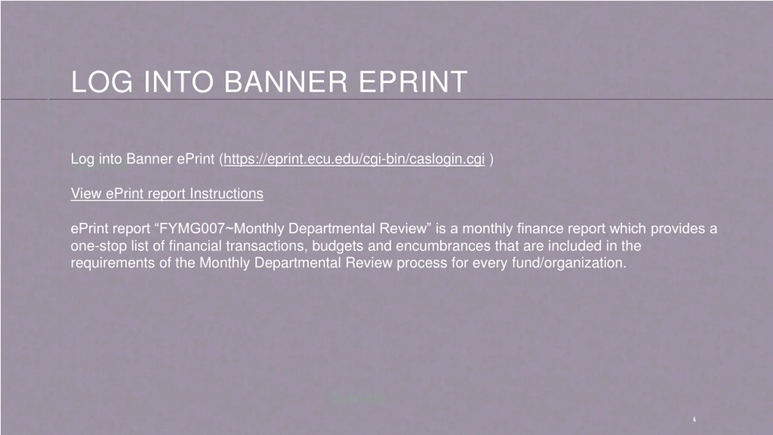 LOG INTO BANNER EPRINT Log into Banner ePrint (https://eprint.ecu.edu/cgi-bin/caslogin.cgi ) Subtitle View ePrint report Instructions ePrint report FYMG007~Monthly Departmental Review is a monthly finance report which provides a one-stop list of financial transactions, budgets and encumbrances that are included in the requirements of the Monthly Departmental Review process for every fund/organization. Subtitle 6
