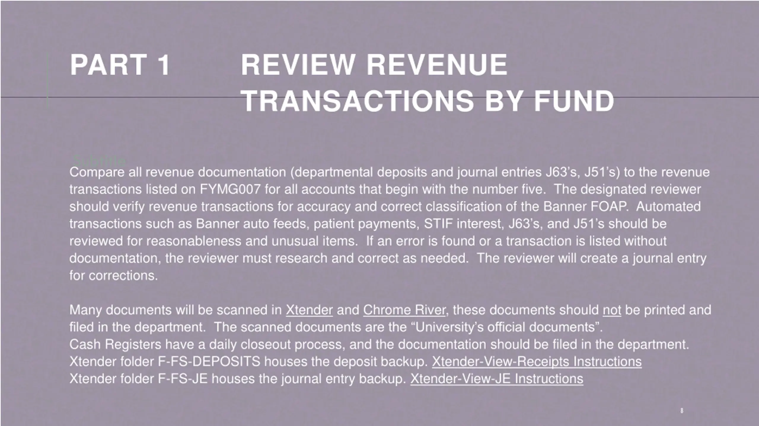 PART 1 REVIEW REVENUE TRANSACTIONS BY FUND Subtitle Compare all revenue documentation (departmental deposits and journal entries J63 s, J51 s) to the revenue transactions listed on FYMG007 for all accounts that begin with the number five. The designated reviewer should verify revenue transactions for accuracy and correct classification of the Banner FOAP. Automated transactions such as Banner auto feeds, patient payments, STIF interest, J63 s, and J51 s should be reviewed for reasonableness and unusual items. If an error is found or a transaction is listed without documentation, the reviewer must research and correct as needed. The reviewer will create a journal entry for corrections. Many documents will be scanned in Xtender and Chrome River, these documents should not be printed and filed in the department. The scanned documents are the University s official documents . Cash Registers have a daily closeout process, and the documentation should be filed in the department. Xtender folder F-FS-DEPOSITS houses the deposit backup. Xtender-View-Receipts Instructions Xtender folder F-FS-JE houses the journal entry backup. Xtender-View-JE Instructions 8