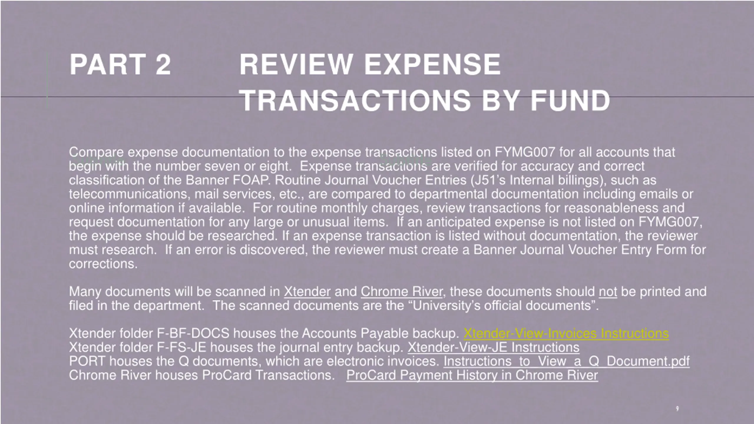 PART 2 REVIEW EXPENSE TRANSACTIONS BY FUND Compare expense documentation to the expense transactions listed on FYMG007 for all accounts that Subtitle begin with the number seven or eight. Expense transactions are verified for accuracy and correct classification of the Banner FOAP. Routine Journal Voucher Entries (J51 s Internal billings), such as telecommunications, mail services, etc., are compared to departmental documentation including emails or online information if available. For routine monthly charges, review transactions for reasonableness and request documentation for any large or unusual items. If an anticipated expense is not listed on FYMG007, the expense should be researched. If an expense transaction is listed without documentation, the reviewer must research. If an error is discovered, the reviewer must create a Banner Journal Voucher Entry Form for corrections. Subtitle Many documents will be scanned in Xtender and Chrome River, these documents should not be printed and filed in the department. The scanned documents are the University s official documents . Xtender folder F-BF-DOCS houses the Accounts Payable backup. Xtender-View-Invoices Instructions Xtender folder F-FS-JE houses the journal entry backup. Xtender-View-JE Instructions PORT houses the Q documents, which are electronic invoices. Instructions_to_View_a_Q_Document.pdf Chrome River houses ProCard Transactions. ProCard Payment History in Chrome River 9