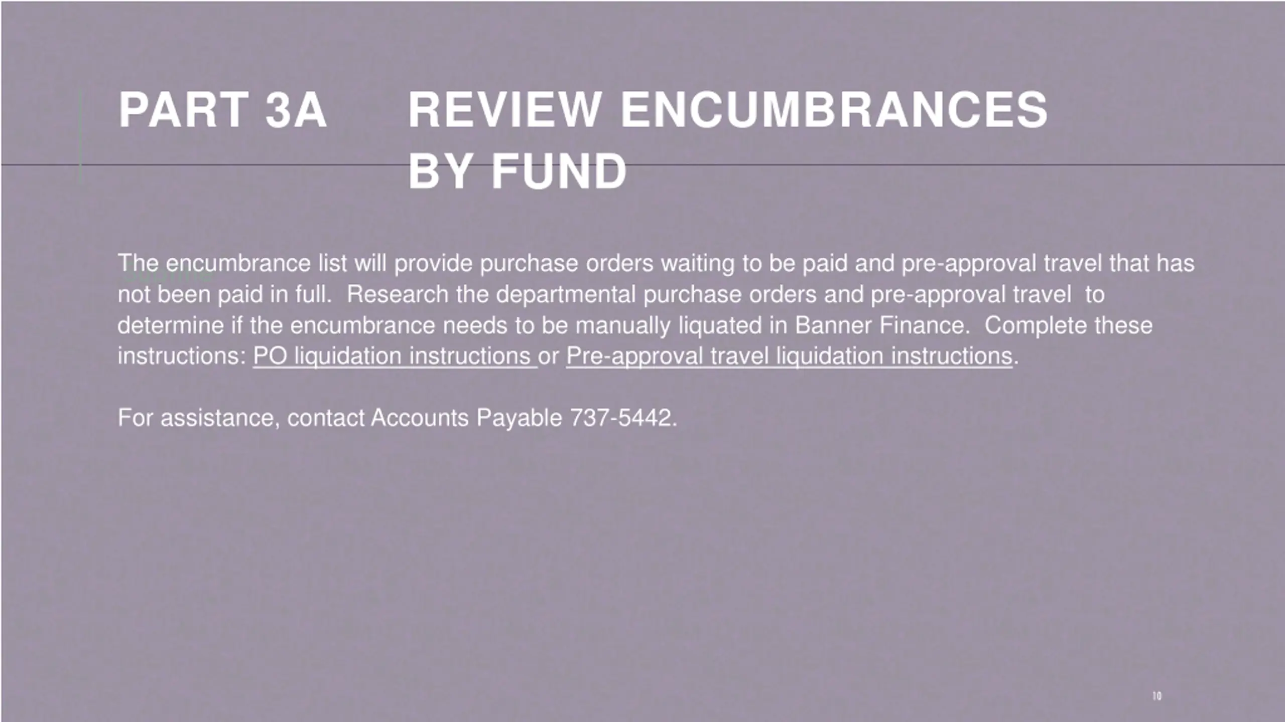 PART 3A REVIEW ENCUMBRANCES BY FUND The encumbrance list will provide purchase orders waiting to be paid and pre-approval travel that has Subtitle not been paid in full. Research the departmental purchase orders and pre-approval travel to determine if the encumbrance needs to be manually liquated in Banner Finance. Complete these instructions: PO liquidation instructions or Pre-approval travel liquidation instructions. For assistance, contact Accounts Payable 737-5442. 10