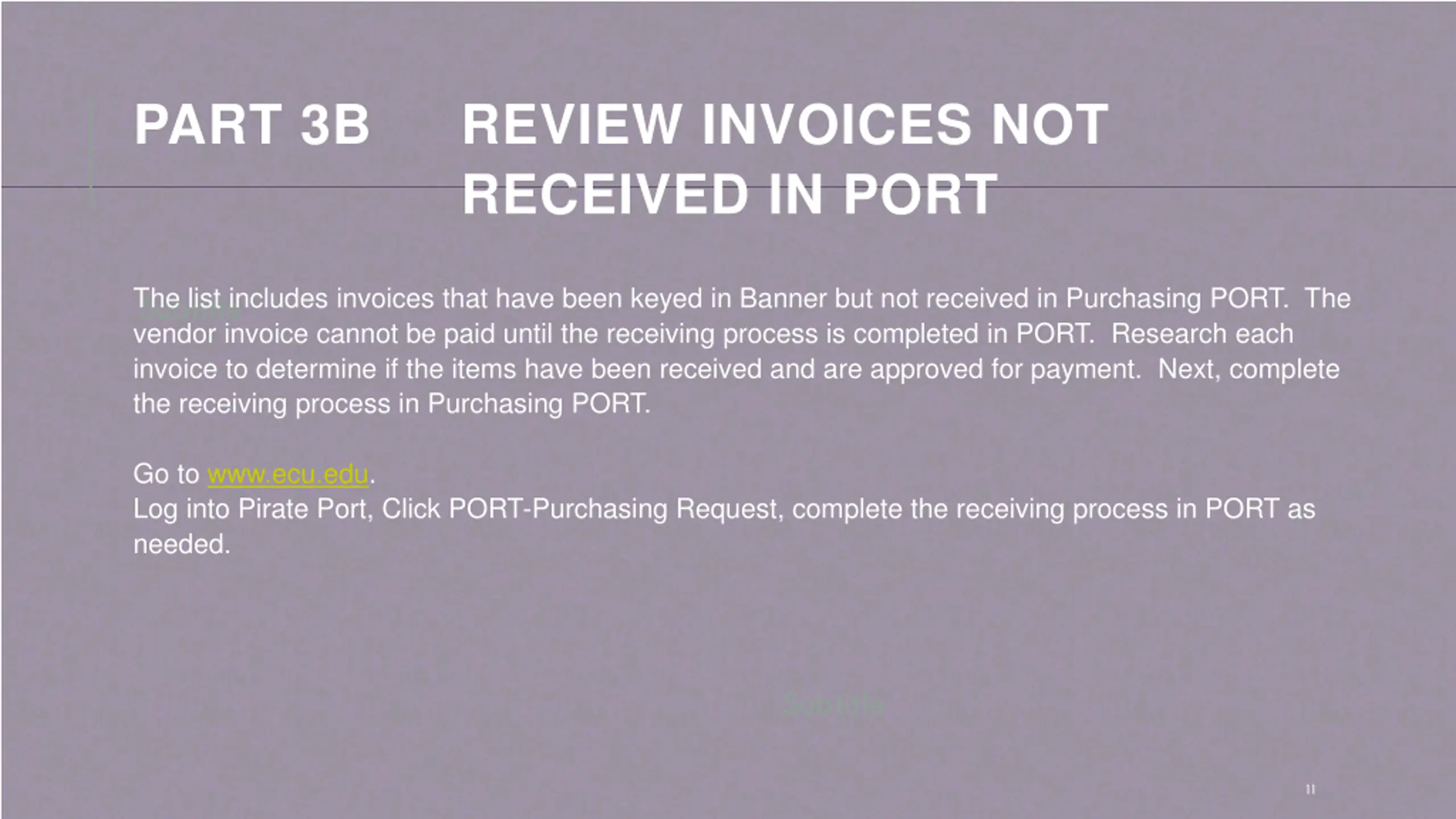 PART 3B REVIEW INVOICES NOT RECEIVED IN PORT The list includes invoices that have been keyed in Banner but not received in Purchasing PORT. The Subtitle vendor invoice cannot be paid until the receiving process is completed in PORT. Research each invoice to determine if the items have been received and are approved for payment. Next, complete the receiving process in Purchasing PORT. Go to www.ecu.edu. Log into Pirate Port, Click PORT-Purchasing Request, complete the receiving process in PORT as needed. Subtitle 11