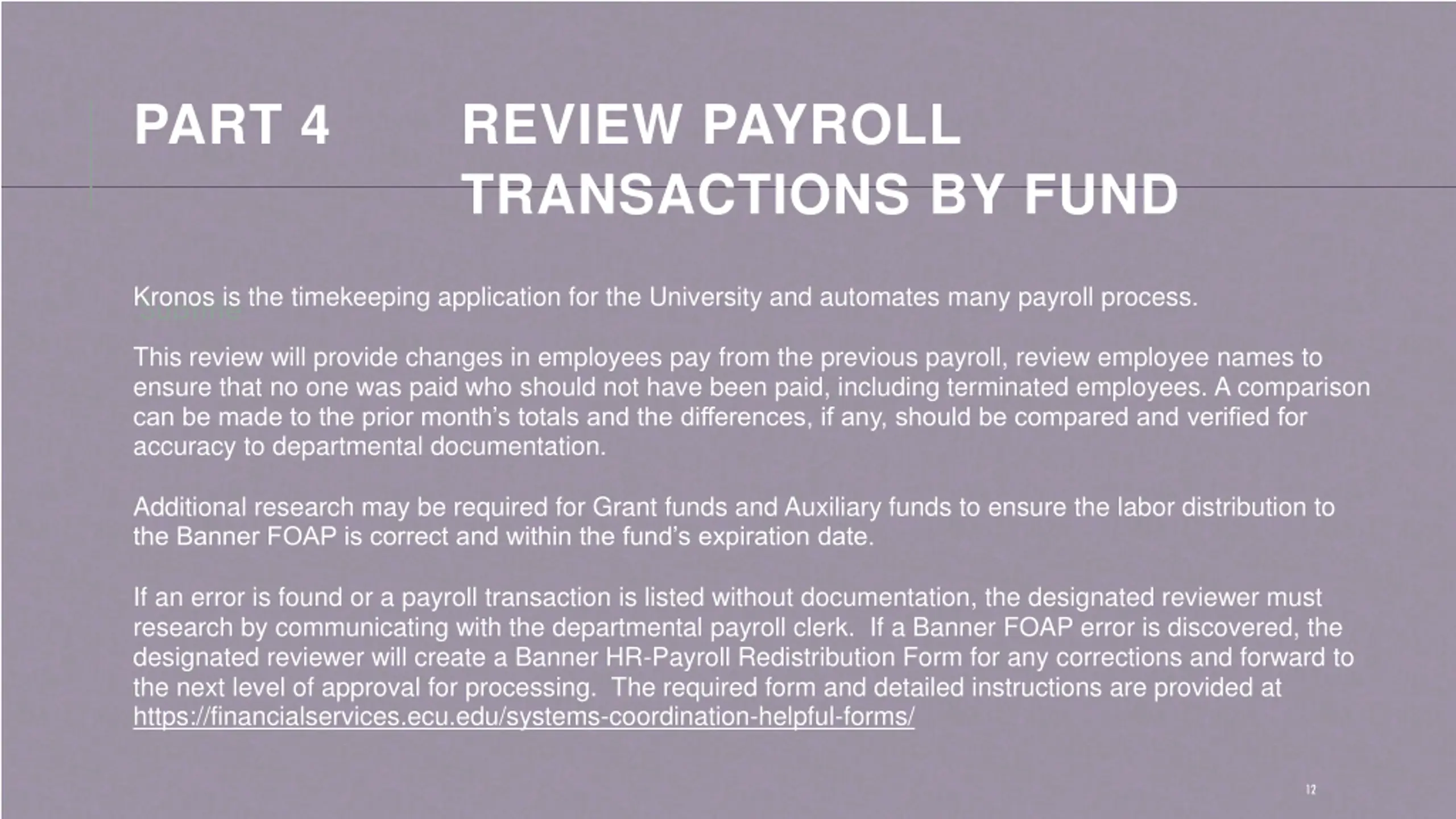 PART 4 REVIEW PAYROLL TRANSACTIONS BY FUND Kronos is the timekeeping application for the University and automates many payroll process. Subtitle This review will provide changes in employees pay from the previous payroll, review employee names to ensure that no one was paid who should not have been paid, including terminated employees. A comparison can be made to the prior month s totals and the differences, if any, should be compared and verified for accuracy to departmental documentation. Additional research may be required for Grant funds and Auxiliary funds to ensure the labor distribution to the Banner FOAP is correct and within the fund s expiration date. If an error is found or a payroll transaction is listed without documentation, the designated reviewer must research by communicating with the departmental payroll clerk. If a Banner FOAP error is discovered, the designated reviewer will create a Banner HR-Payroll Redistribution Form for any corrections and forward to the next level of approval for processing. The required form and detailed instructions are provided at https://financialservices.ecu.edu/systems-coordination-helpful-forms/ 12
