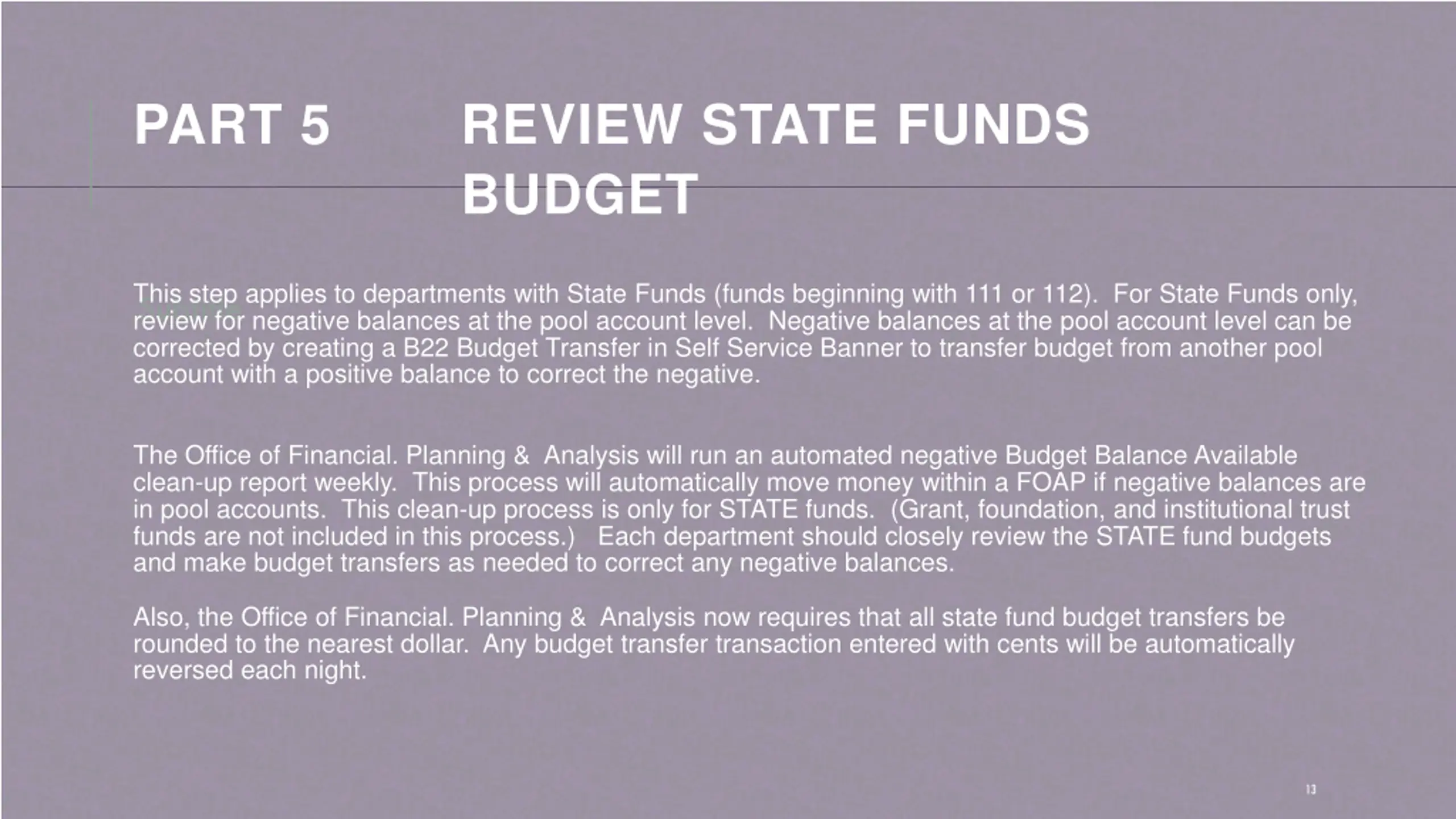 PART 5 REVIEW STATE FUNDS BUDGET This step applies to departments with State Funds (funds beginning with 111 or 112). For State Funds only, Subtitle review for negative balances at the pool account level. Negative balances at the pool account level can be corrected by creating a B22 Budget Transfer in Self Service Banner to transfer budget from another pool account with a positive balance to correct the negative. The Office of Financial. Planning & Analysis will run an automated negative Budget Balance Available clean-up report weekly. This process will automatically move money within a FOAP if negative balances are in pool accounts. This clean-up process is only for STATE funds. (Grant, foundation, and institutional trust funds are not included in this process.) Each department should closely review the STATE fund budgets and make budget transfers as needed to correct any negative balances. Also, the Office of Financial. Planning & Analysis now requires that all state fund budget transfers be rounded to the nearest dollar. Any budget transfer transaction entered with cents will be automatically reversed each night. 13