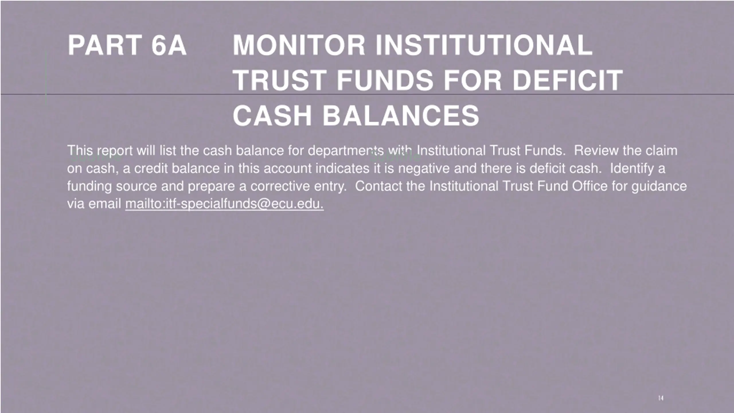 PART 6A MONITOR INSTITUTIONAL TRUST FUNDS FOR DEFICIT CASH BALANCES This report will list the cash balance for departments with Institutional Trust Funds. Review the claim Subtitle Subtitle on cash, a credit balance in this account indicates it is negative and there is deficit cash. Identify a funding source and prepare a corrective entry. Contact the Institutional Trust Fund Office for guidance via email mailto:itf-specialfunds@ecu.edu. 14