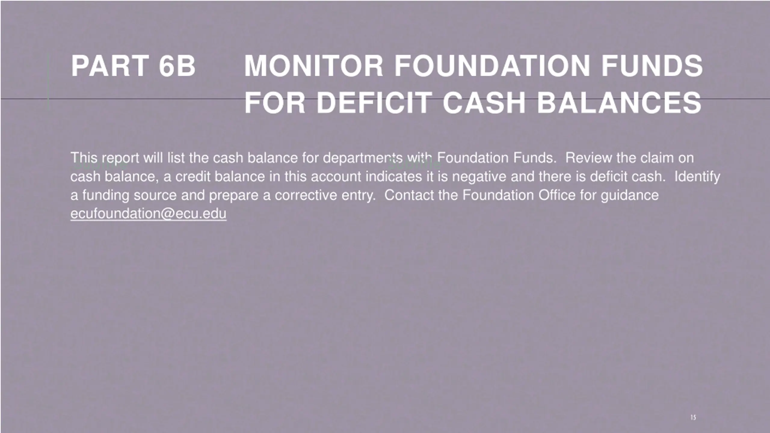 PART 6B MONITOR FOUNDATION FUNDS FOR DEFICIT CASH BALANCES This report will list the cash balance for departments with Foundation Funds. Review the claim on Subtitle cash balance, a credit balance in this account indicates it is negative and there is deficit cash. Identify a funding source and prepare a corrective entry. Contact the Foundation Office for guidance ecufoundation@ecu.edu Subtitle 15
