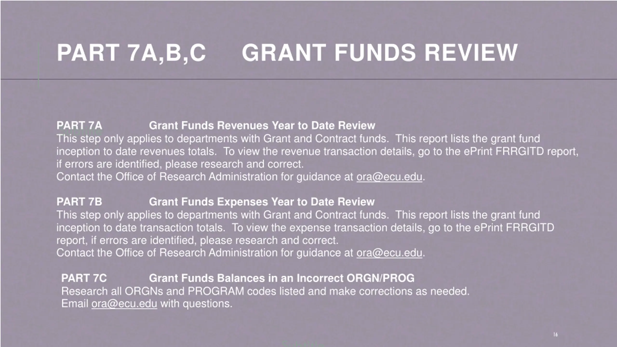 PART 7A,B,C GRANT FUNDS REVIEW PART 7A Grant Funds Revenues Year to Date Review Subtitle This step only applies to departments with Grant and Contract funds. This report lists the grant fund inception to date revenues totals. To view the revenue transaction details, go to the ePrint FRRGITD report, if errors are identified, please research and correct. Contact the Office of Research Administration for guidance at ora@ecu.edu. PART 7B This step only applies to departments with Grant and Contract funds. This report lists the grant fund inception to date transaction totals. To view the expense transaction details, go to the ePrint FRRGITD report, if errors are identified, please research and correct. Contact the Office of Research Administration for guidance at ora@ecu.edu. Grant Funds Expenses Year to Date Review PART 7C Research all ORGNs and PROGRAM codes listed and make corrections as needed. Email ora@ecu.edu with questions. Grant Funds Balances in an Incorrect ORGN/PROG 16 Subtitle