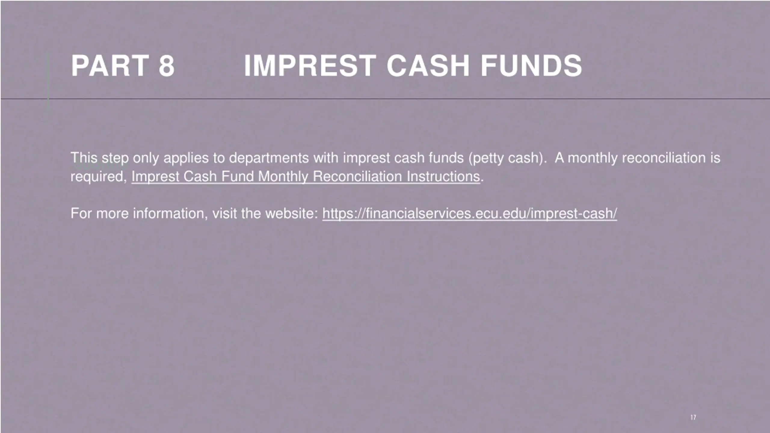 PART 8 IMPREST CASH FUNDS This step only applies to departments with imprest cash funds (petty cash). A monthly reconciliation is Subtitle required, Imprest Cash Fund Monthly Reconciliation Instructions. For more information, visit the website: https://financialservices.ecu.edu/imprest-cash/ 17