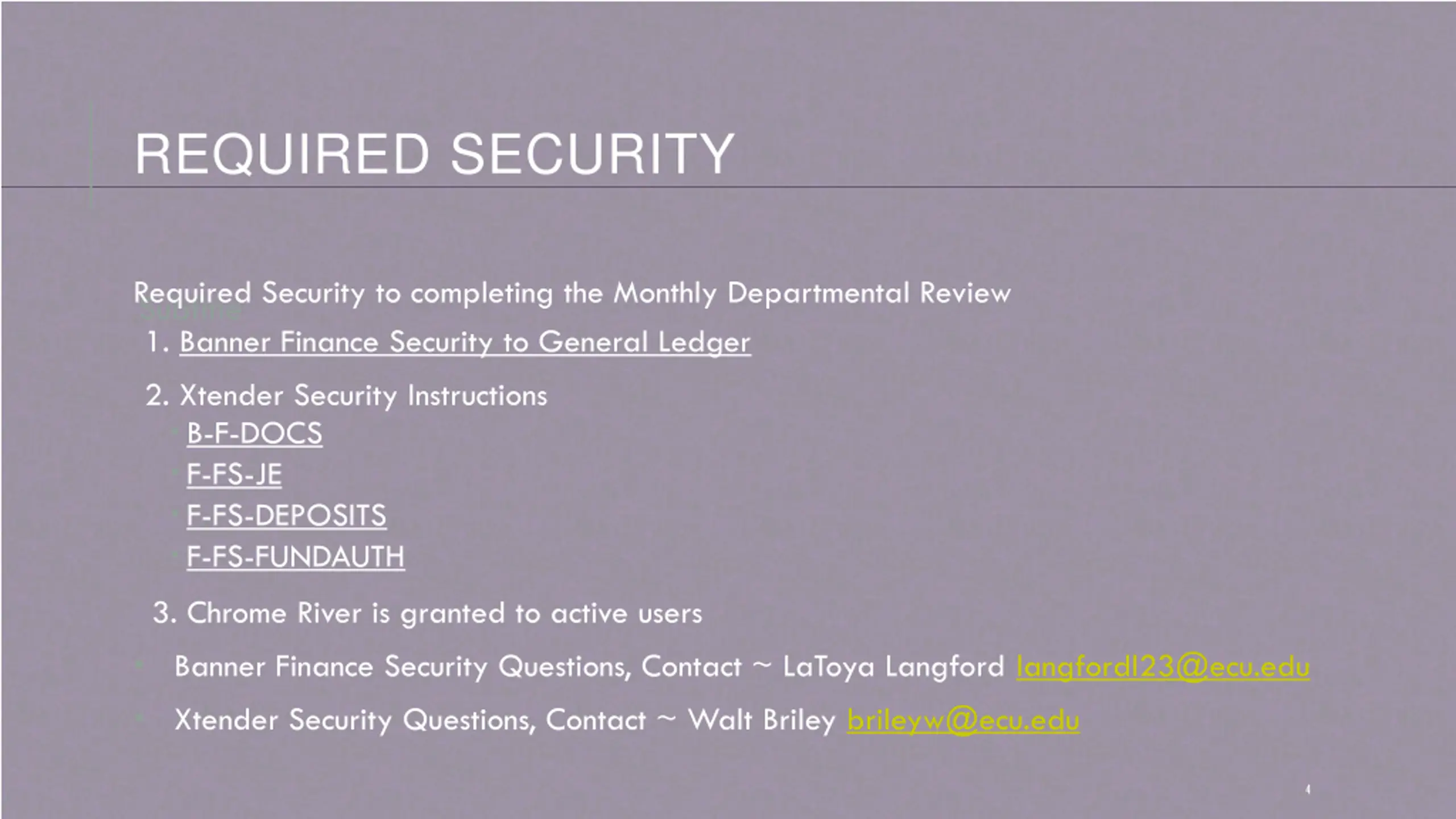 REQUIRED SECURITY Required Security to completing the Monthly Departmental Review Subtitle 1. Banner Finance Security to General Ledger 2. Xtender Security Instructions B-F-DOCS F-FS-JE F-FS-DEPOSITS F-FS-FUNDAUTH 3. Chrome River is granted to active users Banner Finance Security Questions, Contact ~ LaToya Langford langfordl23@ecu.edu Xtender Security Questions, Contact ~ Walt Briley brileyw@ecu.edu 4