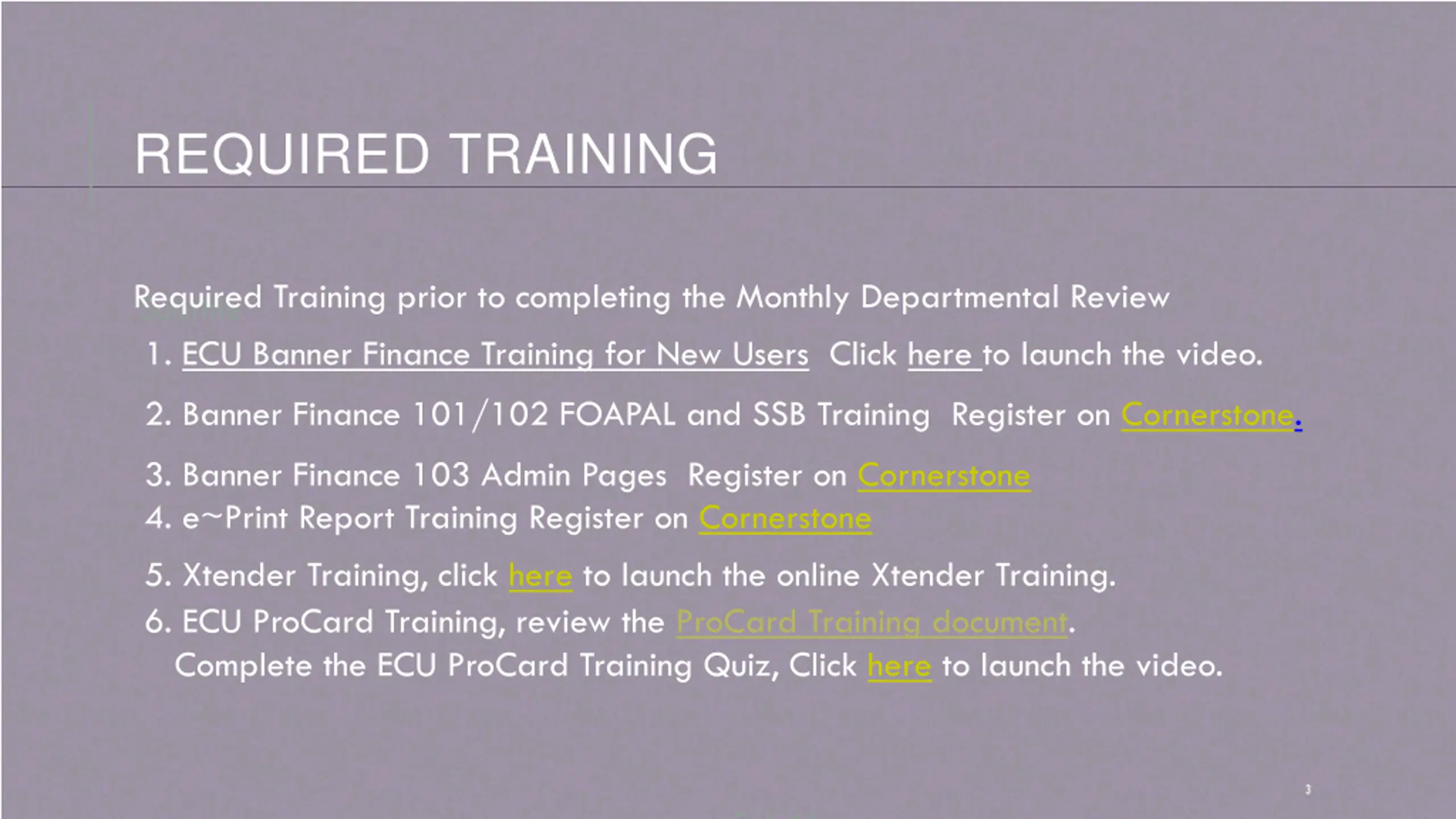 REQUIRED TRAINING Subtitle Required Training prior to completing the Monthly Departmental Review 1. ECU Banner Finance Training for New Users Click here to launch the video. 2. Banner Finance 101/102 FOAPAL and SSB Training Register on Cornerstone. 3. Banner Finance 103 Admin Pages Register on Cornerstone 4. e~Print Report Training Register on Cornerstone 5. Xtender Training, click here to launch the online Xtender Training. 6. ECU ProCard Training, review the ProCard Training document. Complete the ECU ProCard Training Quiz, Click here to launch the video. 3 Subtitle
