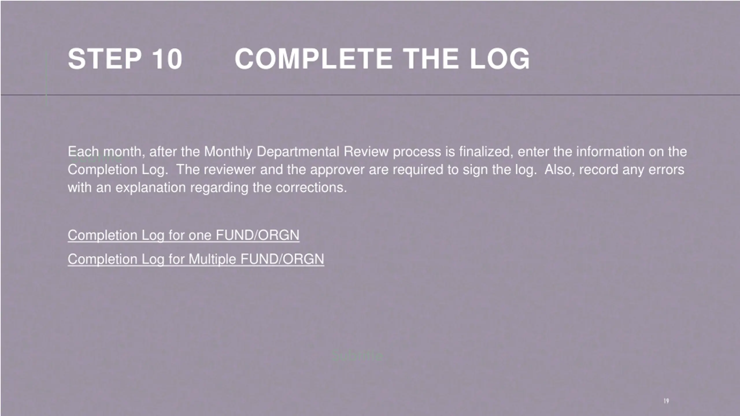 STEP 10 COMPLETE THE LOG Each month, after the Monthly Departmental Review process is finalized, enter the information on the Subtitle Completion Log. The reviewer and the approver are required to sign the log. Also, record any errors with an explanation regarding the corrections. Completion Log for one FUND/ORGN Completion Log for Multiple FUND/ORGN Subtitle 19