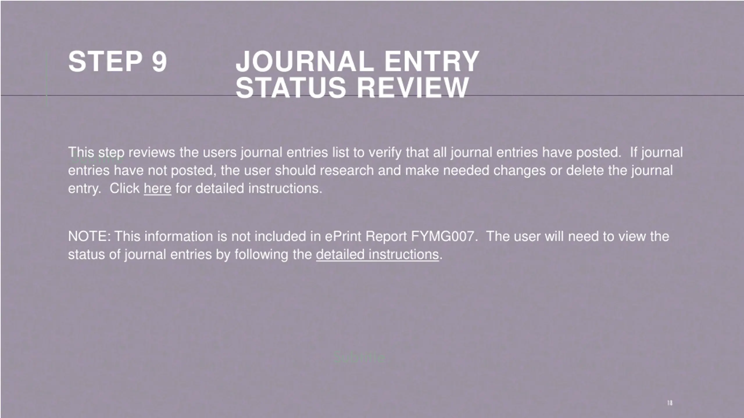 STEP 9 JOURNAL ENTRY STATUS REVIEW This step reviews the users journal entries list to verify that all journal entries have posted. If journal Subtitle entries have not posted, the user should research and make needed changes or delete the journal entry. Click here for detailed instructions. NOTE: This information is not included in ePrint Report FYMG007. The user will need to view the status of journal entries by following the detailed instructions. Subtitle 18