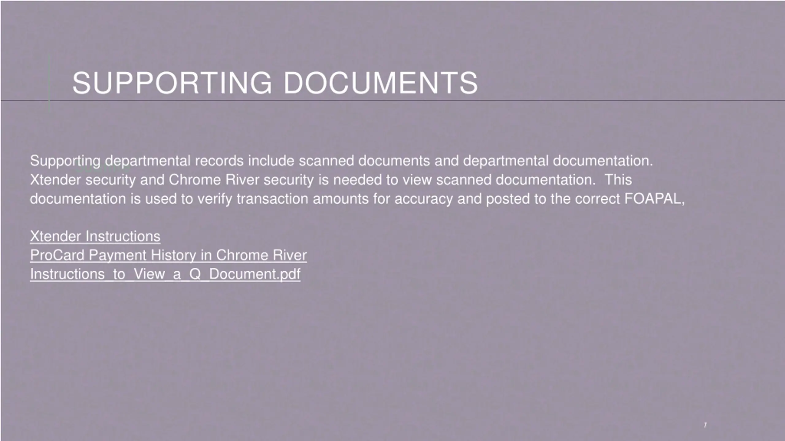 SUPPORTING DOCUMENTS Supporting departmental records include scanned documents and departmental documentation. Xtender security and Chrome River security is needed to view scanned documentation. This documentation is used to verify transaction amounts for accuracy and posted to the correct FOAPAL, Subtitle Xtender Instructions ProCard Payment History in Chrome River Instructions_to_View_a_Q_Document.pdf 7