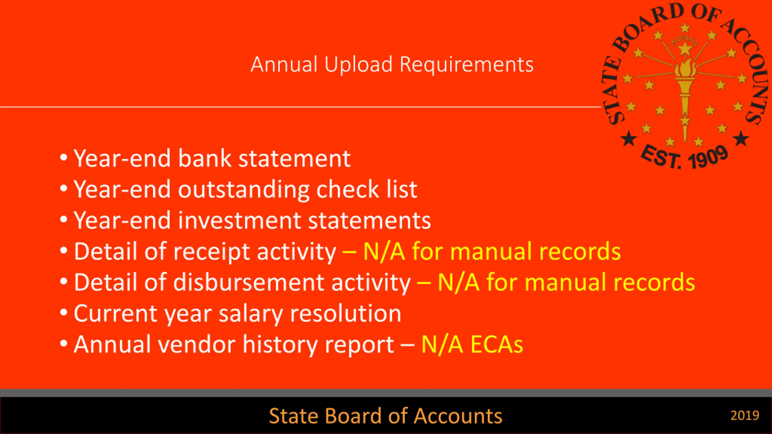 Annual Upload Requirements Year-end bank statement Year-end outstanding check list Year-end investment statements Detail of receipt activity N/A for manual records Detail of disbursement activity N/A for manual records Current year salary resolution Annual vendor history report N/A ECAs State Board of Accounts 2019