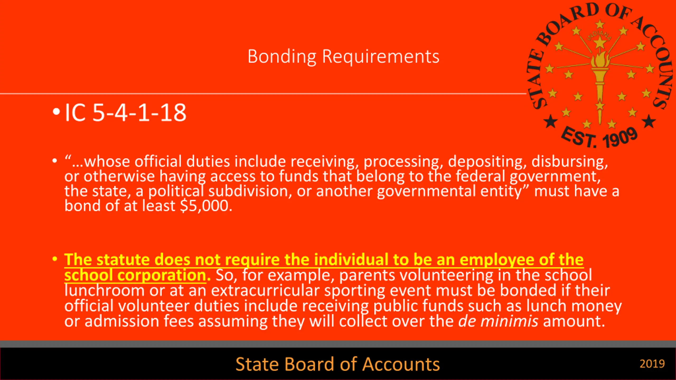 Bonding Requirements IC 5-4-1-18 whose official duties include receiving, processing, depositing, disbursing, or otherwise having access to funds that belong to the federal government, the state, a political subdivision, or another governmental entity must have a bond of at least $5,000. The statute does not require the individual to be an employee of the school corporation. So, for example, parents volunteering in the school lunchroom or at an extracurricular sporting event must be bonded if their official volunteer duties include receiving public funds such as lunch money or admission fees assuming they will collect over the de minimis amount. State Board of Accounts 2019