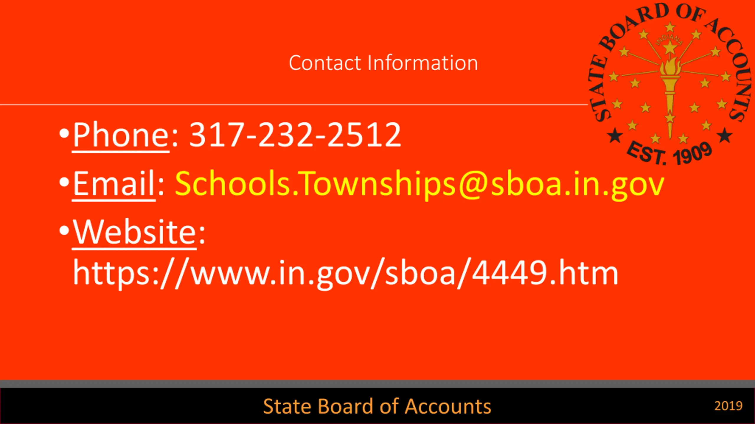 Contact Information Phone: 317-232-2512 Email: Schools.Townships@sboa.in.gov Website: https://www.in.gov/sboa/4449.htm State Board of Accounts 2019
