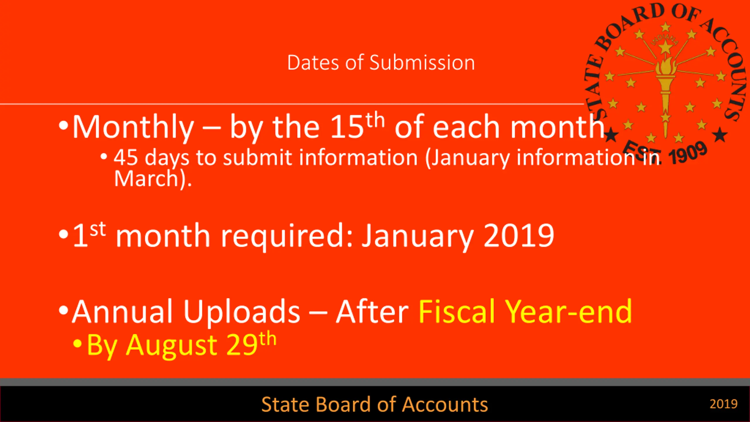 Dates of Submission Monthly by the 15thof each month 45 days to submit information (January information in March). 1stmonth required: January 2019 Annual Uploads After Fiscal Year-end By August 29th State Board of Accounts 2019