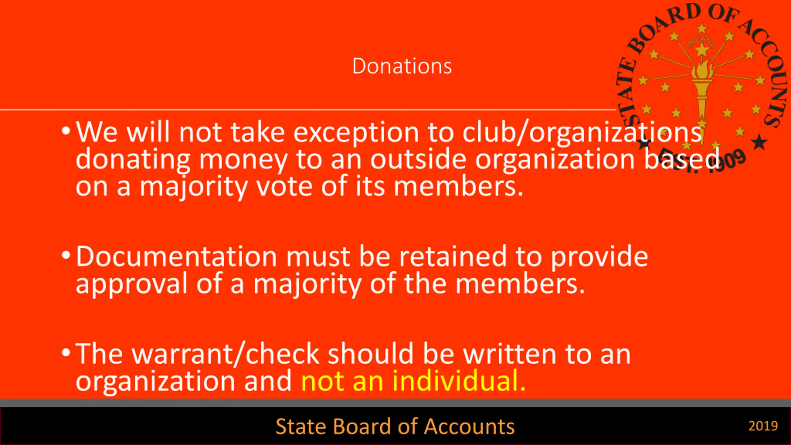 Donations We will not take exception to club/organizations donating money to an outside organization based on a majority vote of its members. Documentation must be retained to provide approval of a majority of the members. The warrant/check should be written to an organization and not an individual. State Board of Accounts 2019