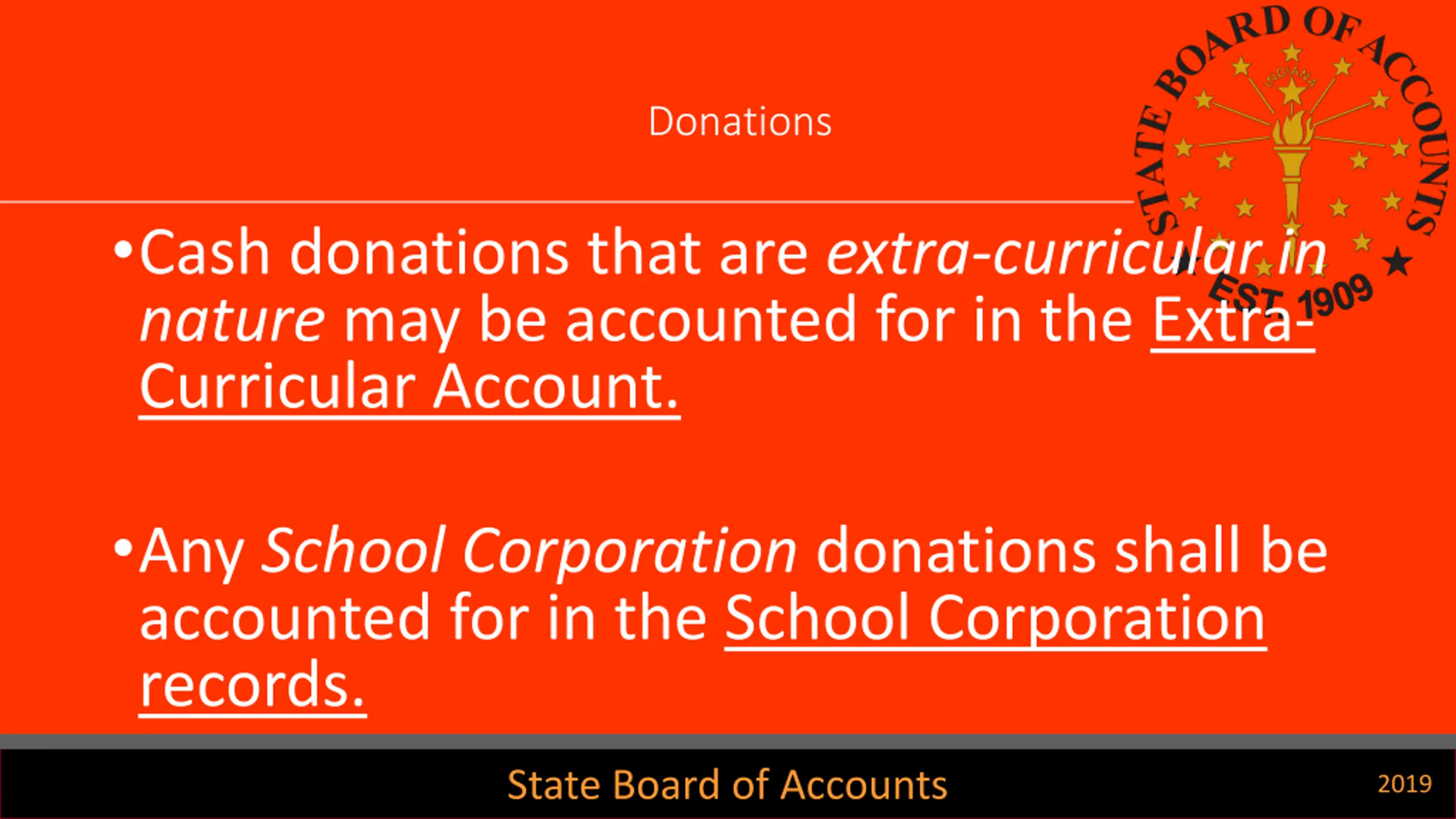 Donations Cash donations that are extra-curricular in nature may be accounted for in the Extra- Curricular Account. Any School Corporation donations shall be accounted for in the School Corporation records. State Board of Accounts 2019