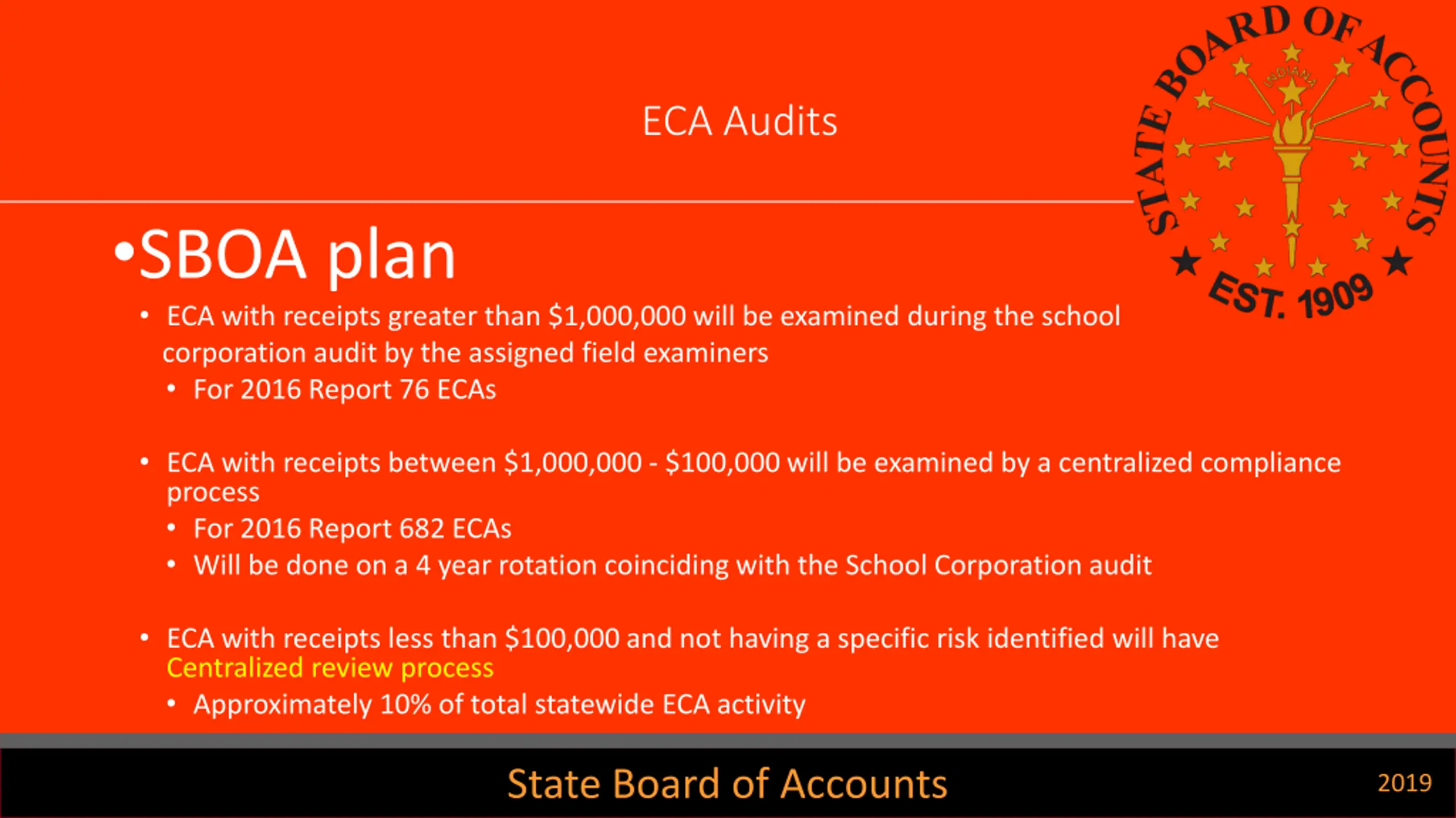 ECA Audits SBOA plan ECA with receipts greater than $1,000,000 will be examined during the school corporation audit by the assigned field examiners For 2016 Report 76 ECAs ECA with receipts between $1,000,000 - $100,000 will be examined by a centralized compliance process For 2016 Report 682 ECAs Will be done on a 4 year rotation coinciding with the School Corporation audit ECA with receipts less than $100,000 and not having a specific risk identified will have Centralized review process Approximately 10% of total statewide ECA activity State Board of Accounts 2019