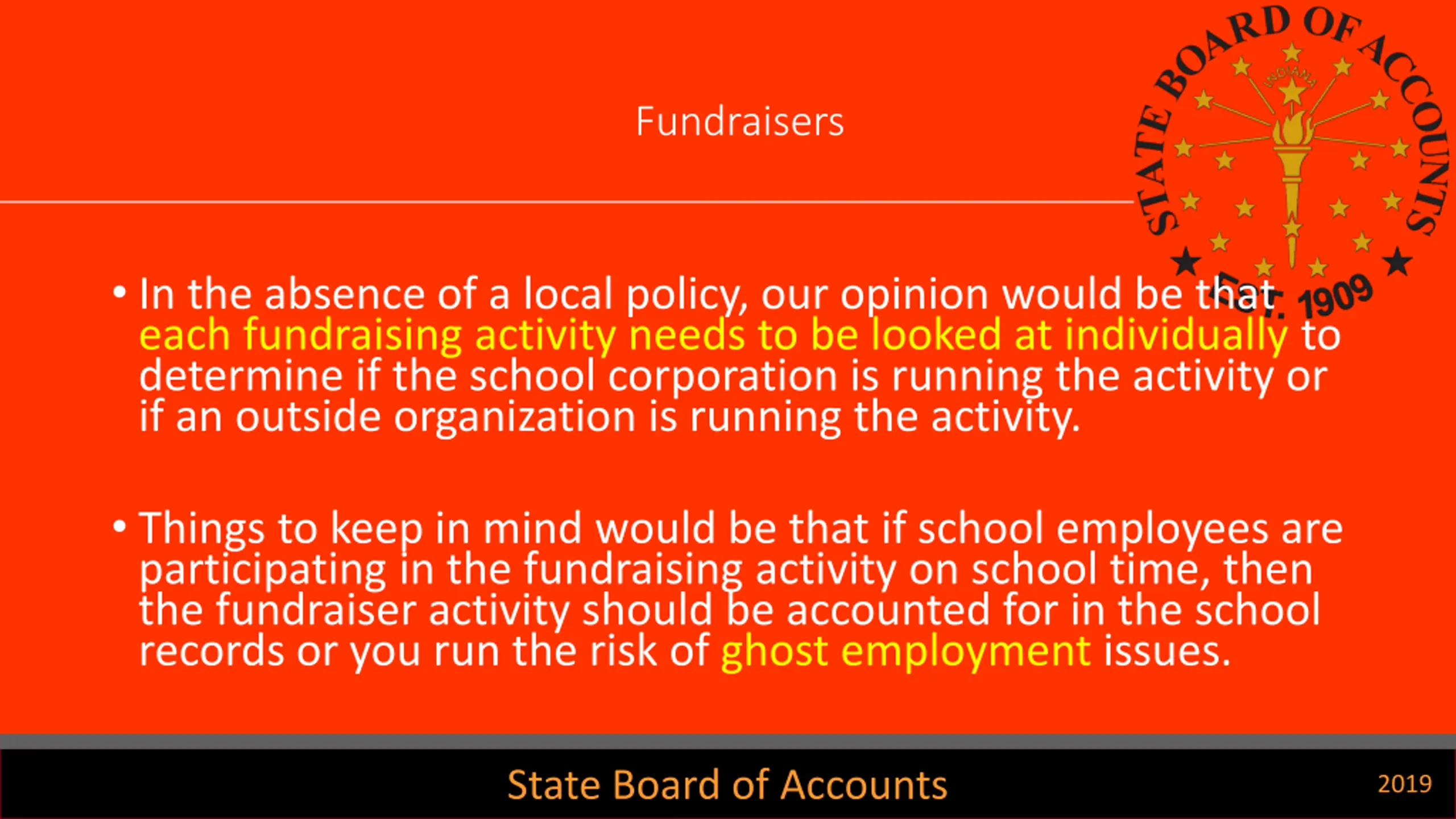 Fundraisers In the absence of a local policy, our opinion would be that each fundraising activity needs to be looked at individually to determine if the school corporation is running the activity or if an outside organization is running the activity. Things to keep in mind would be that if school employees are participating in the fundraising activity on school time, then the fundraiser activity should be accounted for in the school records or you run the risk of ghost employment issues. State Board of Accounts 2019