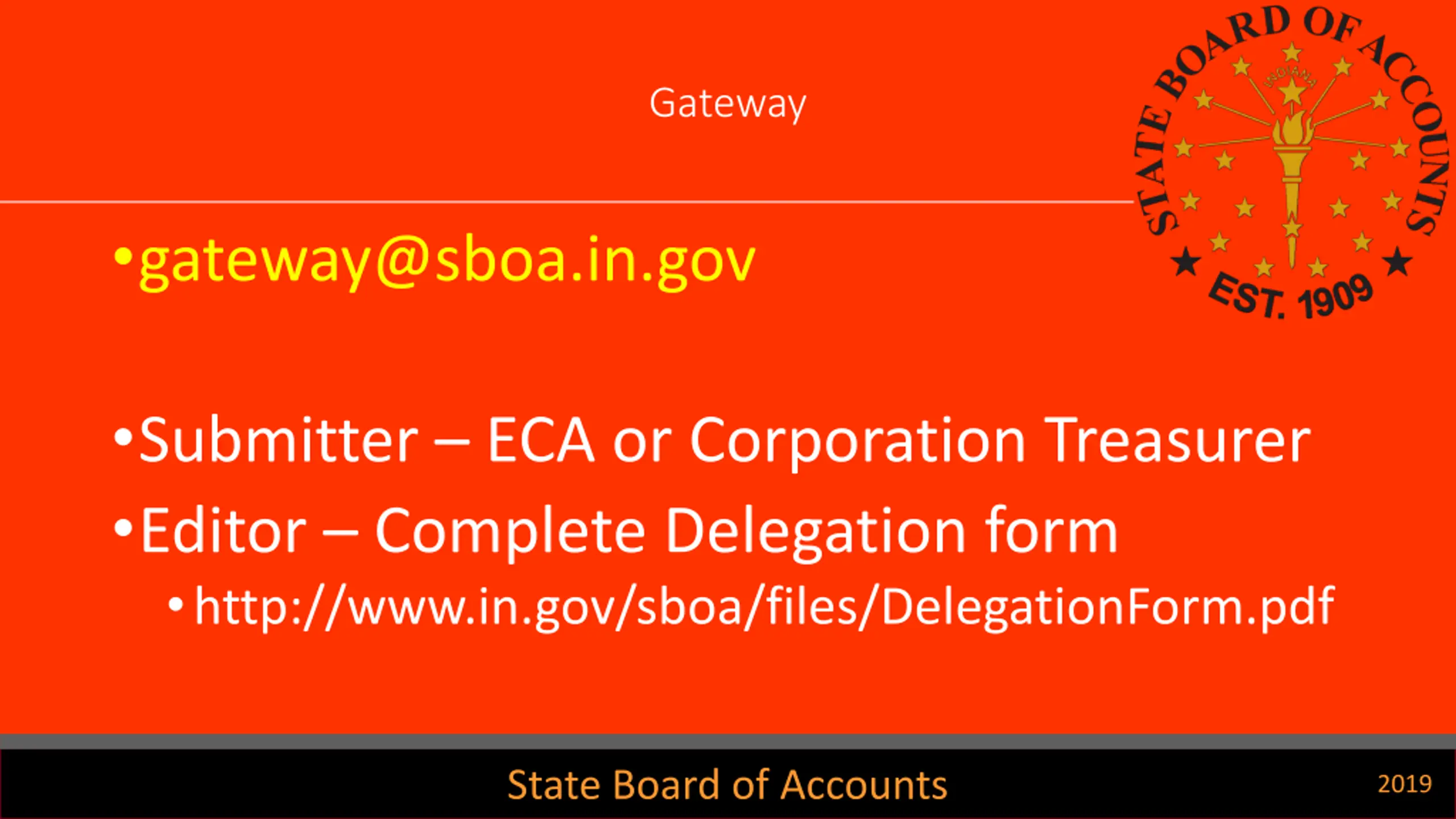 Gateway gateway@sboa.in.gov Submitter ECA or Corporation Treasurer Editor Complete Delegation form http://www.in.gov/sboa/files/DelegationForm.pdf State Board of Accounts 2019