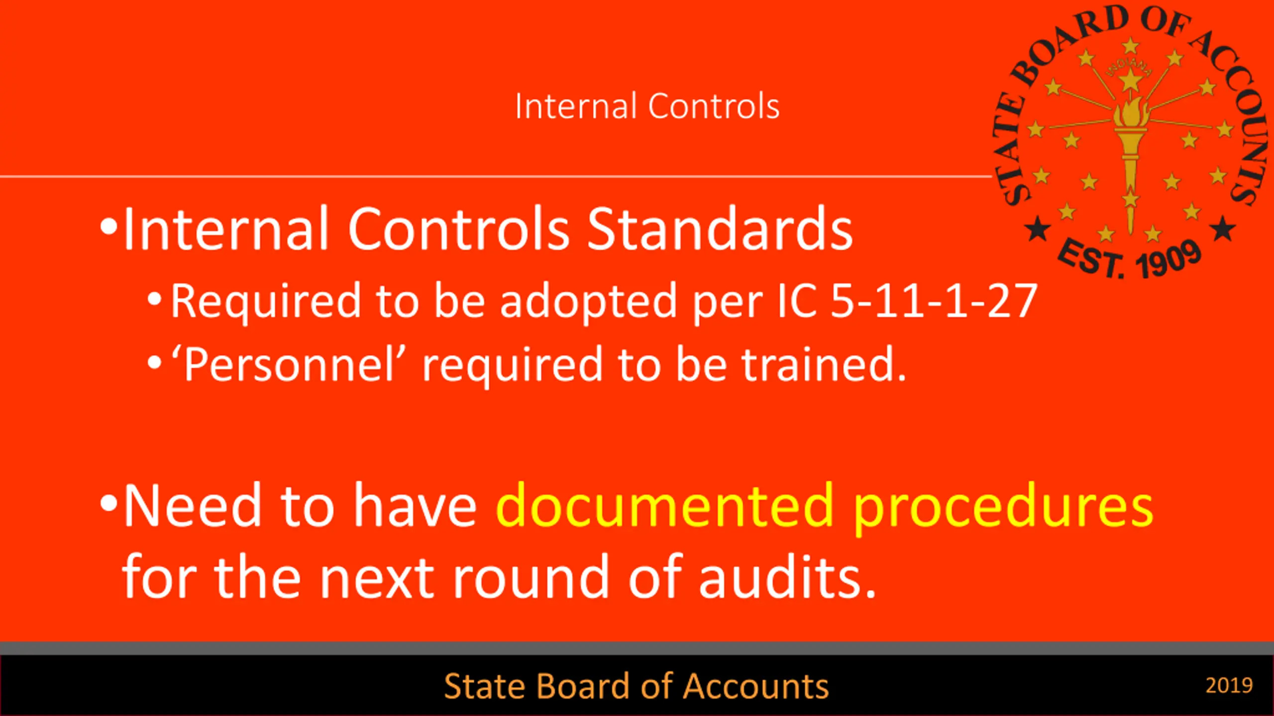 Internal Controls Internal Controls Standards Required to be adopted per IC 5-11-1-27 Personnel required to be trained. Need to have documented procedures for the next round of audits. State Board of Accounts 2019