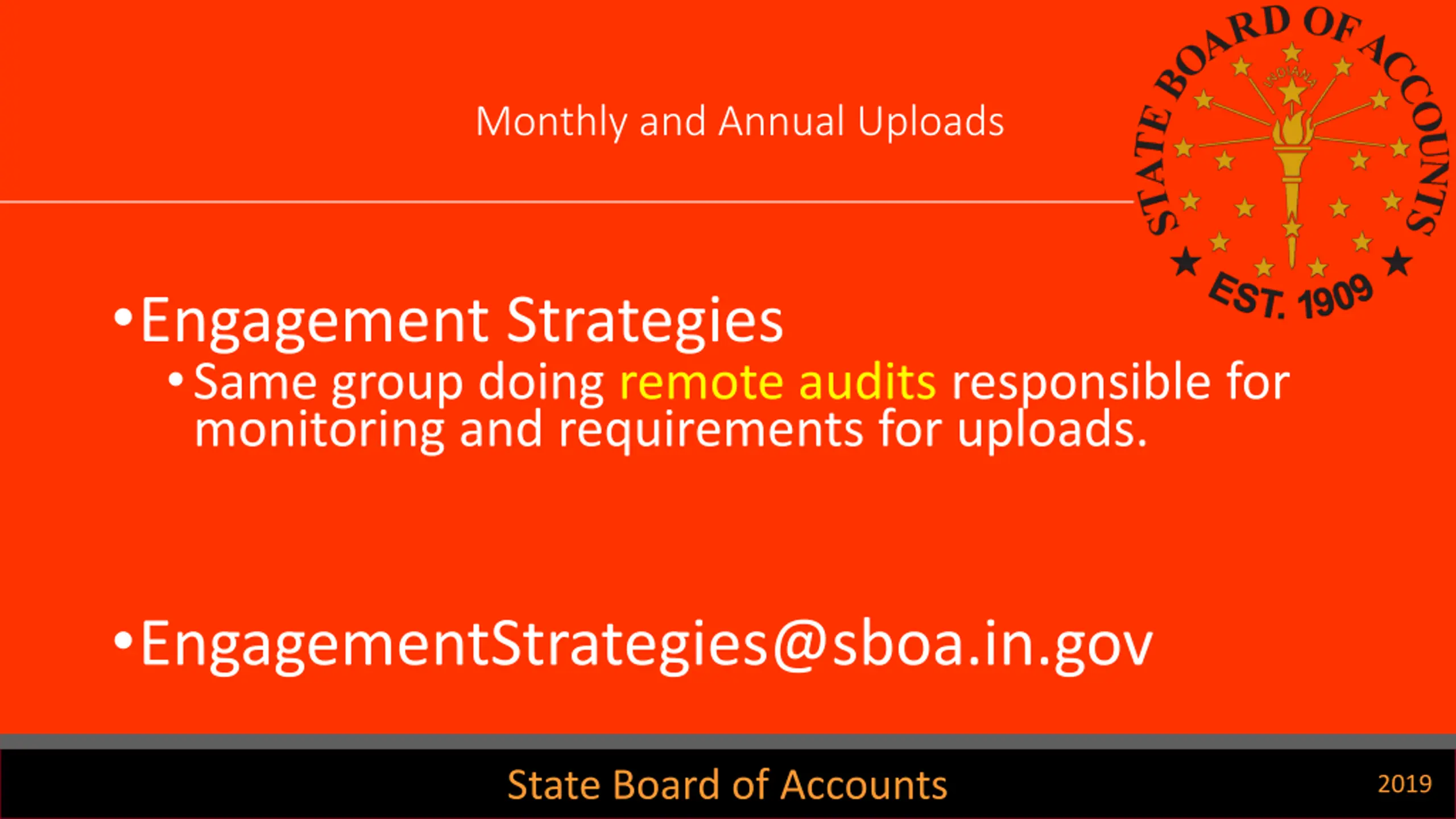 Monthly and Annual Uploads Engagement Strategies Same group doing remote audits responsible for monitoring and requirements for uploads. EngagementStrategies@sboa.in.gov State Board of Accounts 2019
