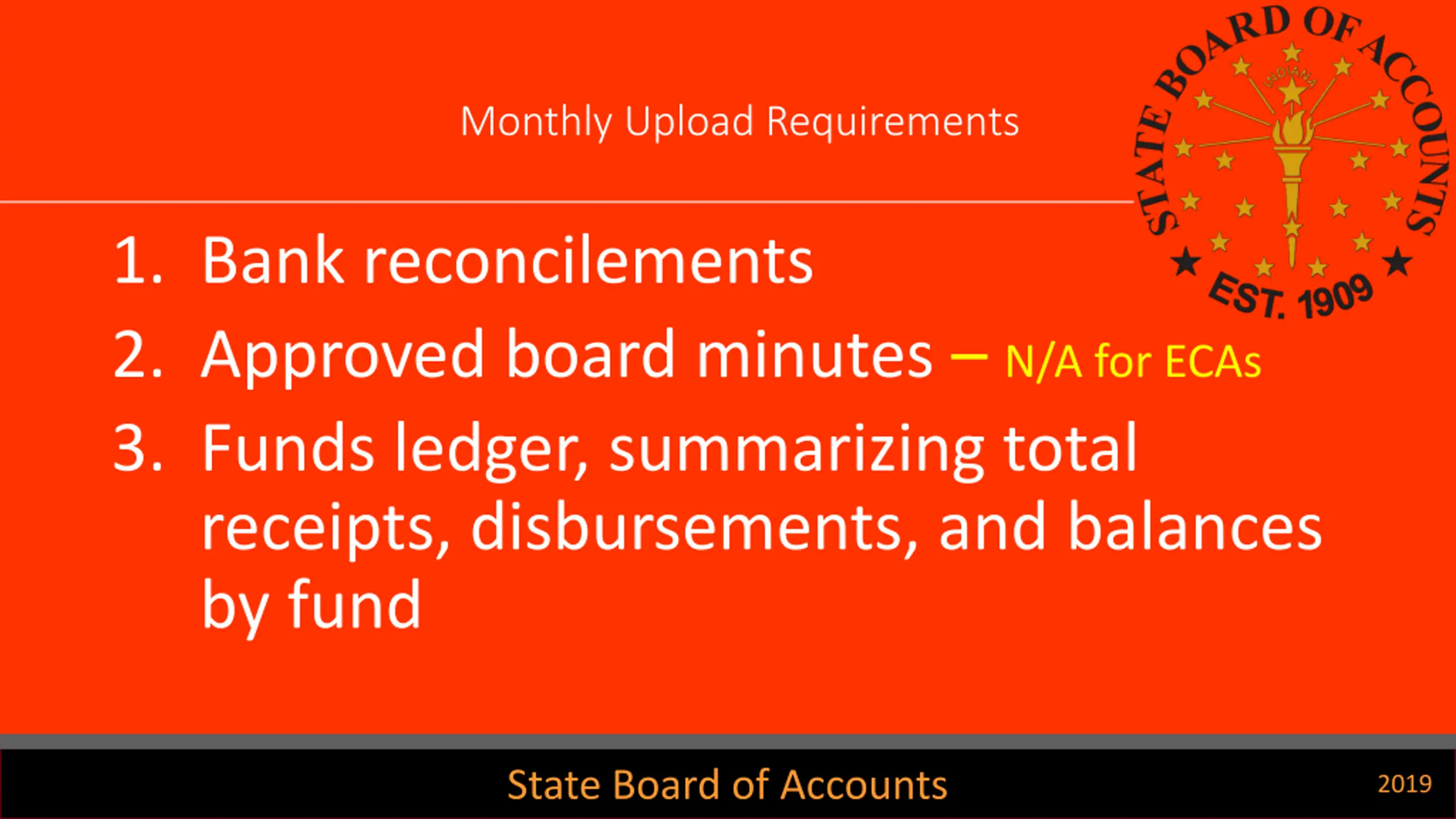 Monthly Upload Requirements 1. Bank reconcilements 2. Approved board minutes N/A for ECAs 3. Funds ledger, summarizing total receipts, disbursements, and balances by fund State Board of Accounts 2019