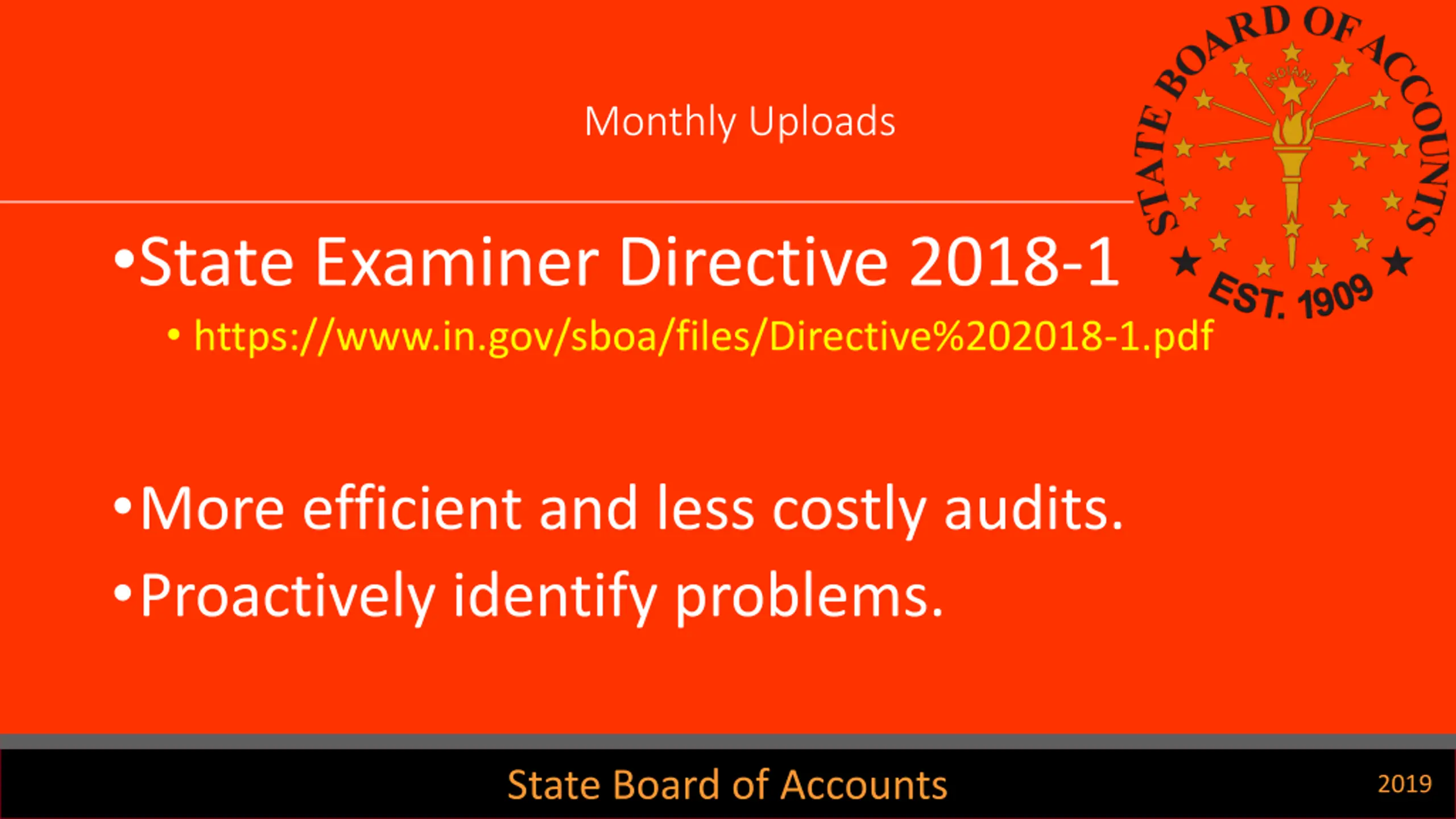 Monthly Uploads State Examiner Directive 2018-1 https://www.in.gov/sboa/files/Directive%202018-1.pdf More efficient and less costly audits. Proactively identify problems. State Board of Accounts 2019