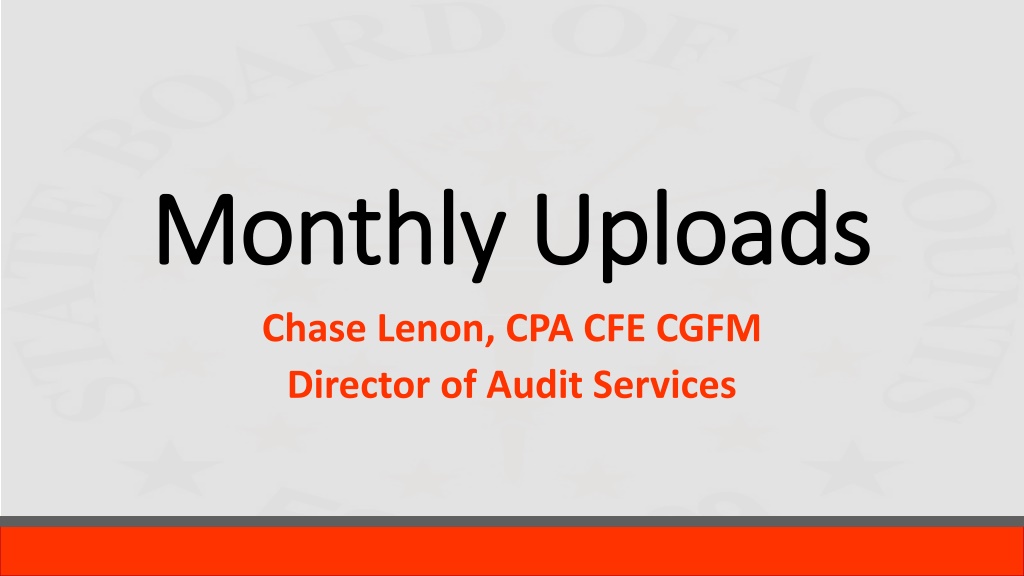 Monthly Uploads Monthly Uploads Chase Lenon, CPA CFE CGFM Director of Audit Services State Board of Accounts 2019