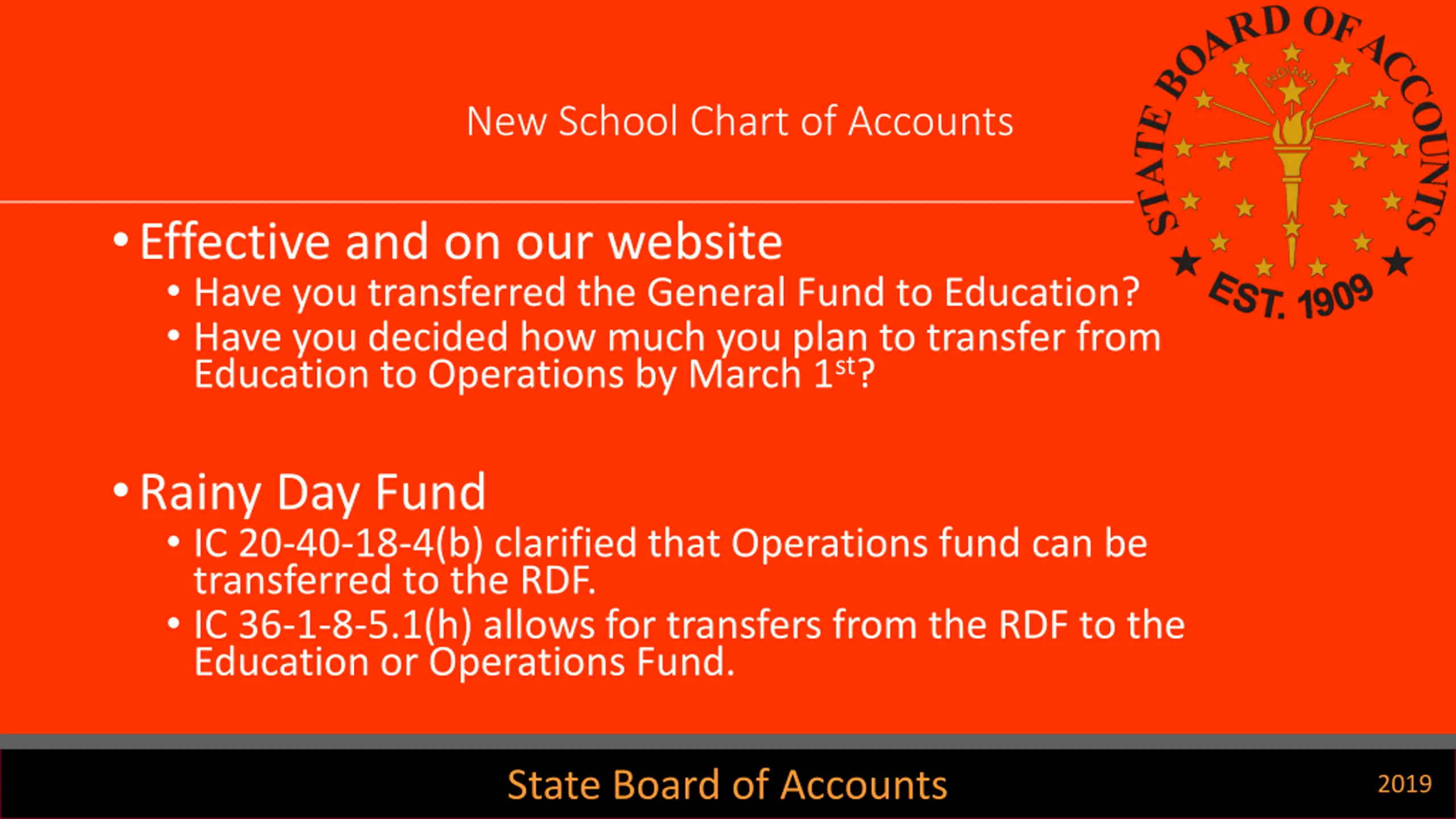 New School Chart of Accounts Effective and on our website Have you transferred the General Fund to Education? Have you decided how much you plan to transfer from Education to Operations by March 1st? Rainy Day Fund IC 20-40-18-4(b) clarified that Operations fund can be transferred to the RDF. IC 36-1-8-5.1(h) allows for transfers from the RDF to the Education or Operations Fund. State Board of Accounts 2019