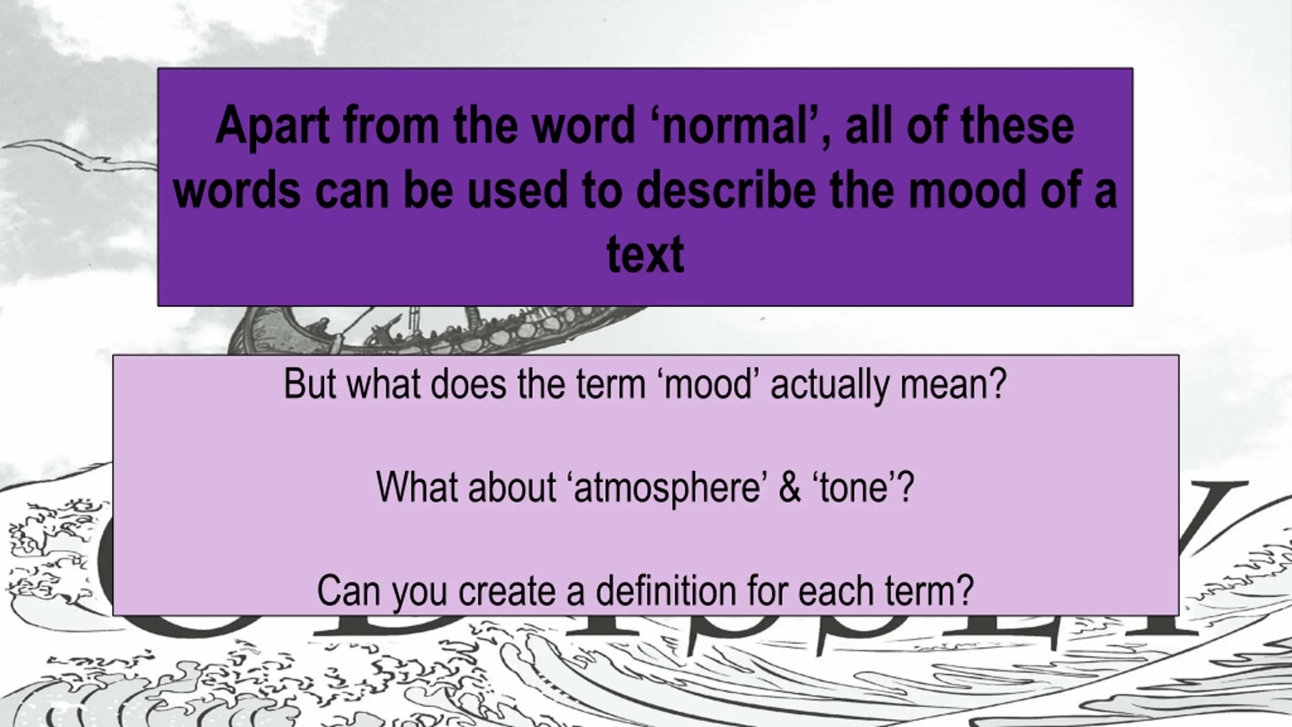 Apart from the word normal, all of these words can be used to describe the mood of a text But what does the term mood actually mean? What about atmosphere & tone ? Can you create a definition for each term?